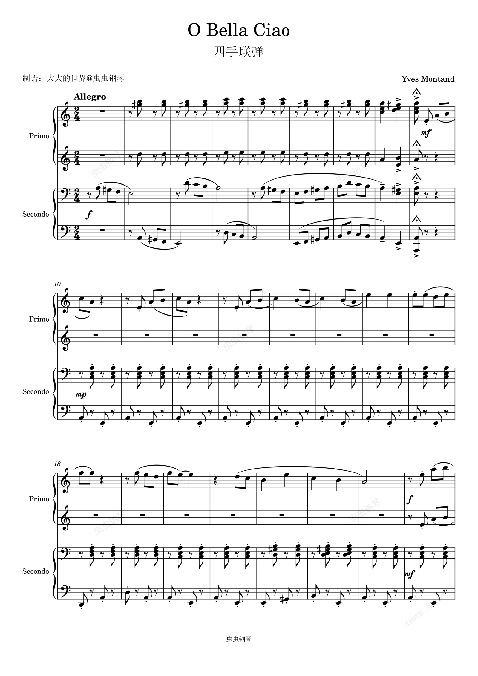 钢琴谱:O Bella Ciao 啊朋友再见(四手联弹)