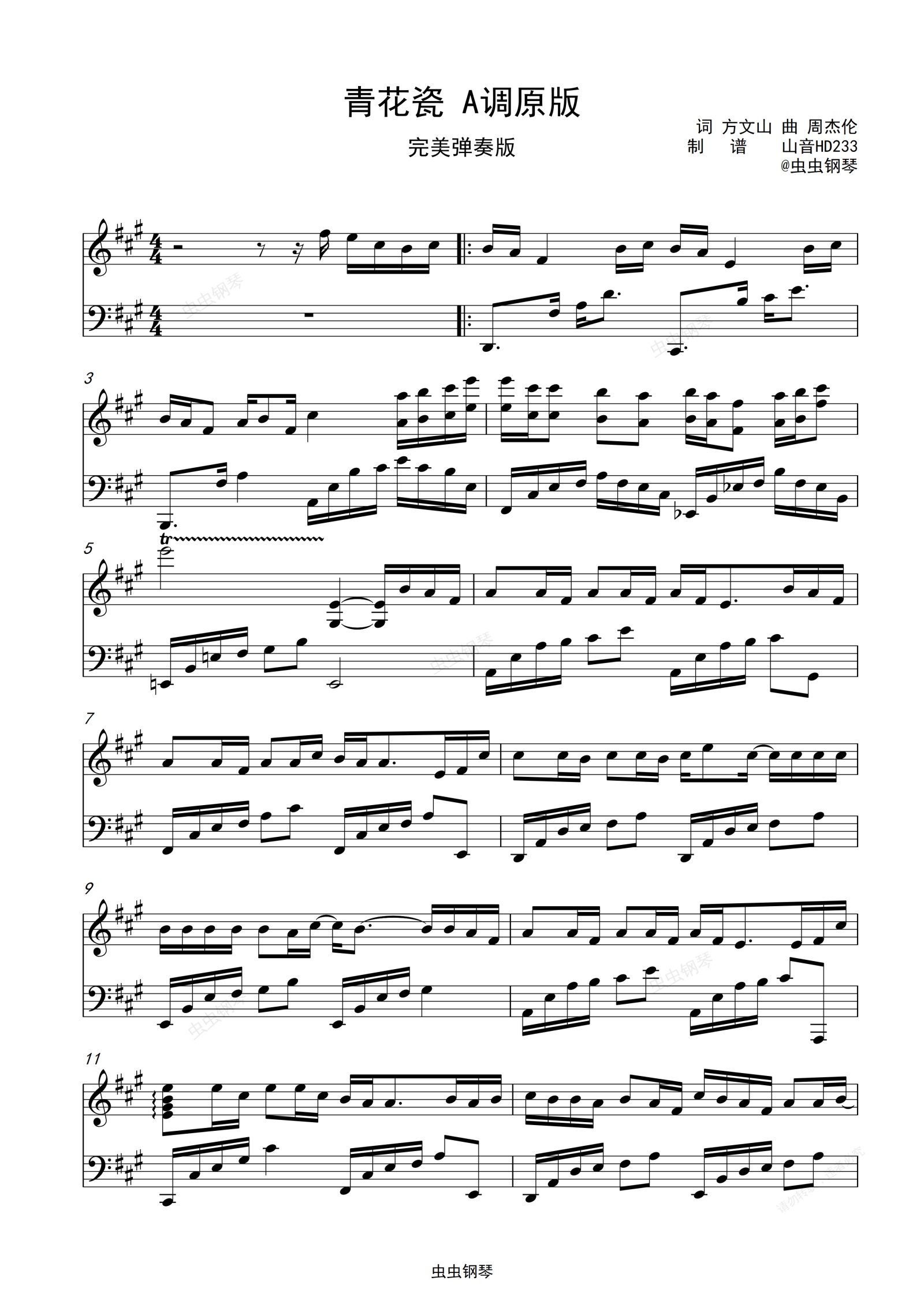 钢琴谱:青花瓷--周杰伦 A调原调 完美弹奏版