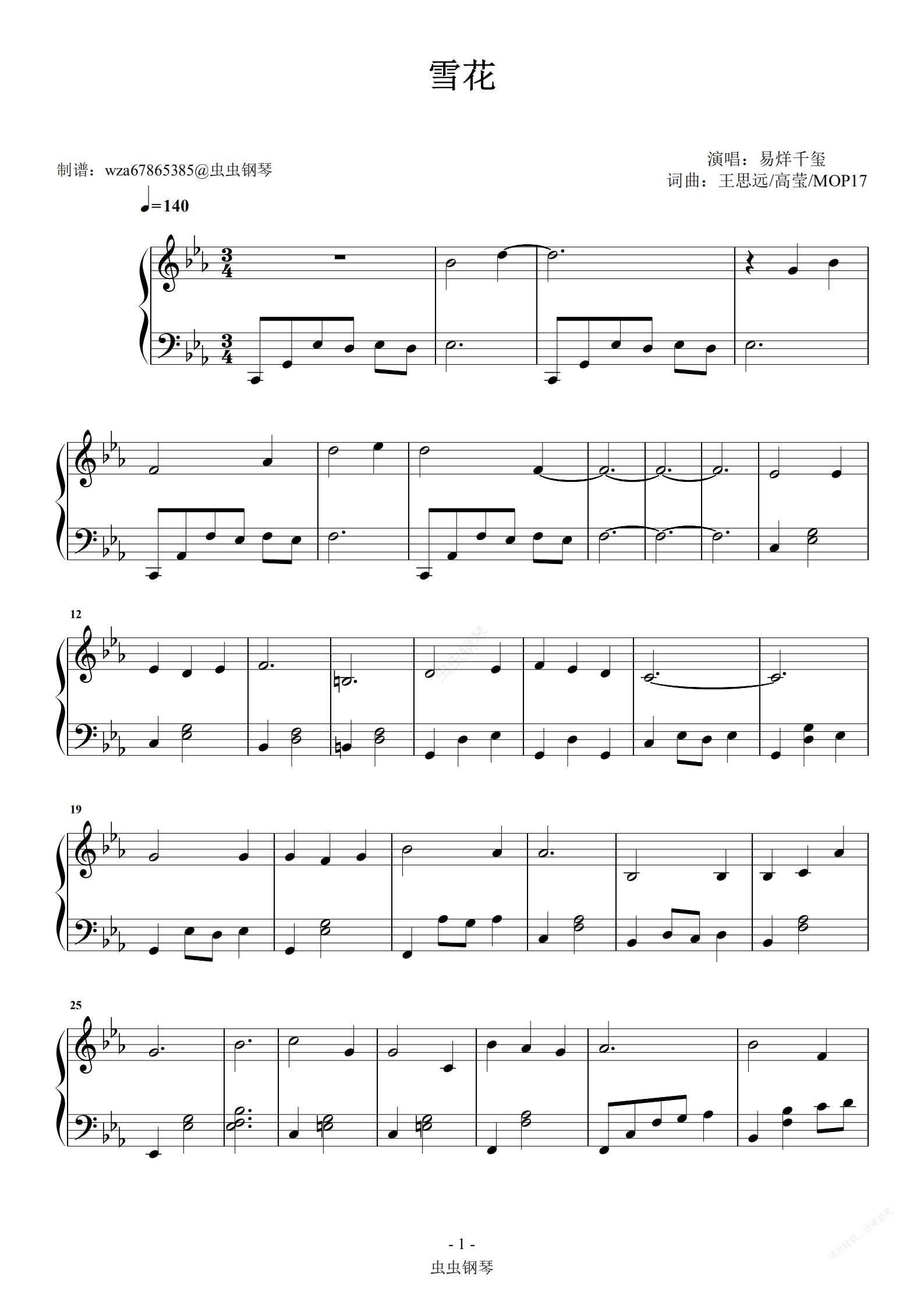 钢琴谱:雪花 (易烊千玺)