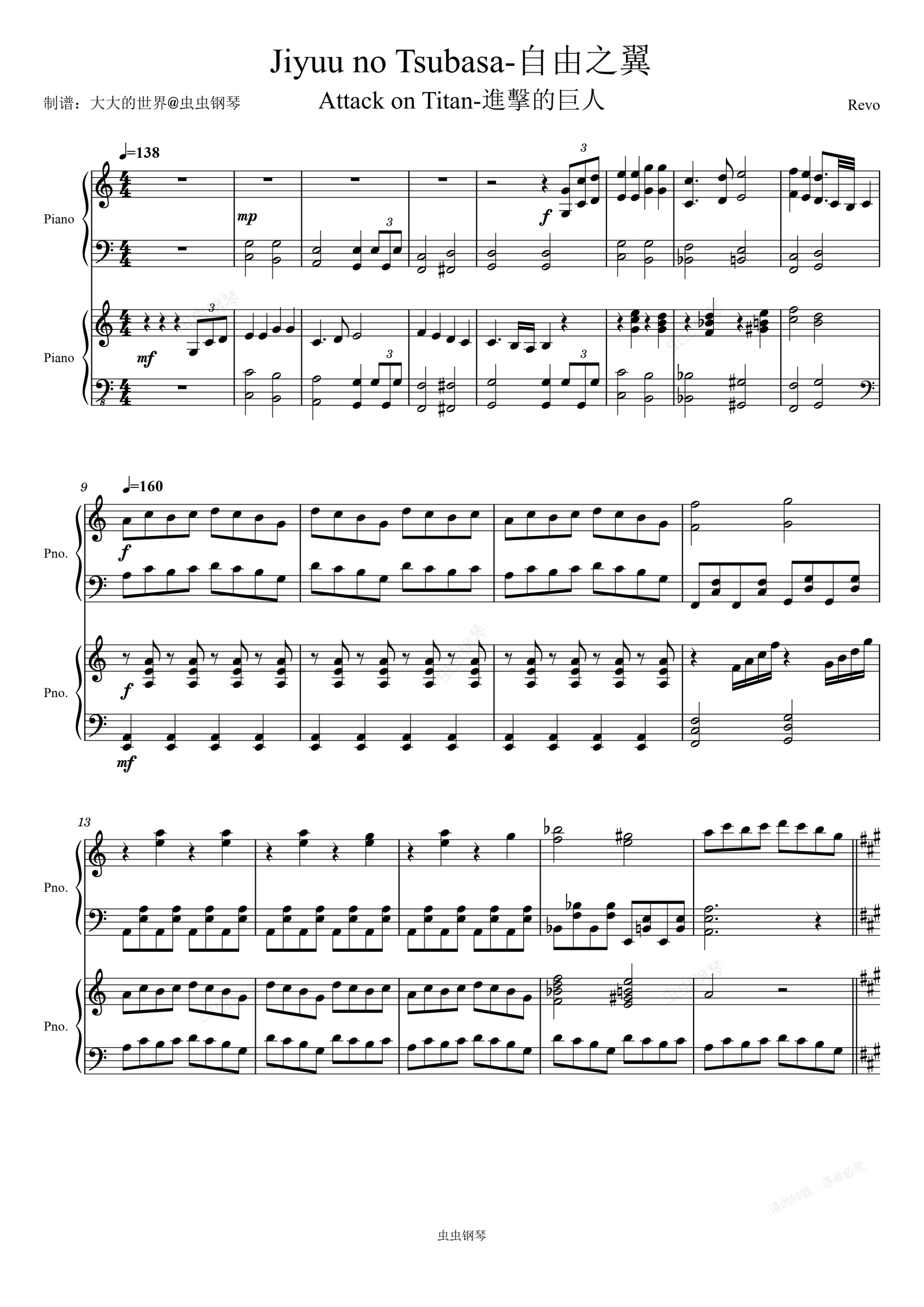 钢琴谱:Jiyuu no Tsubasa-自由之翼【四手联弹】-Attack on Titan-進擊的巨人