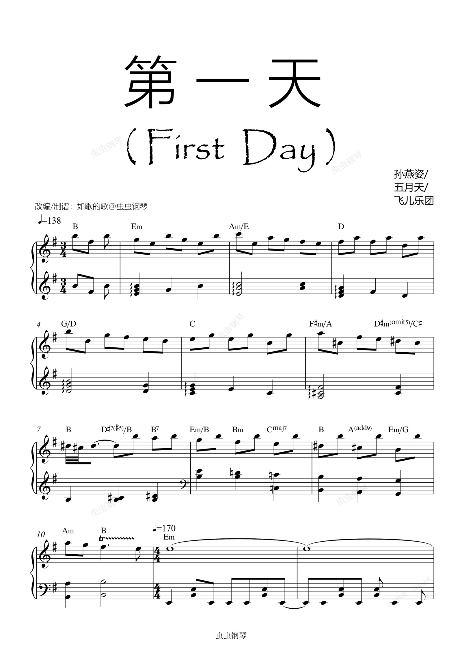 钢琴谱:第一天First Day原调可弹唱-孙燕姿/五月天/F.I.R.