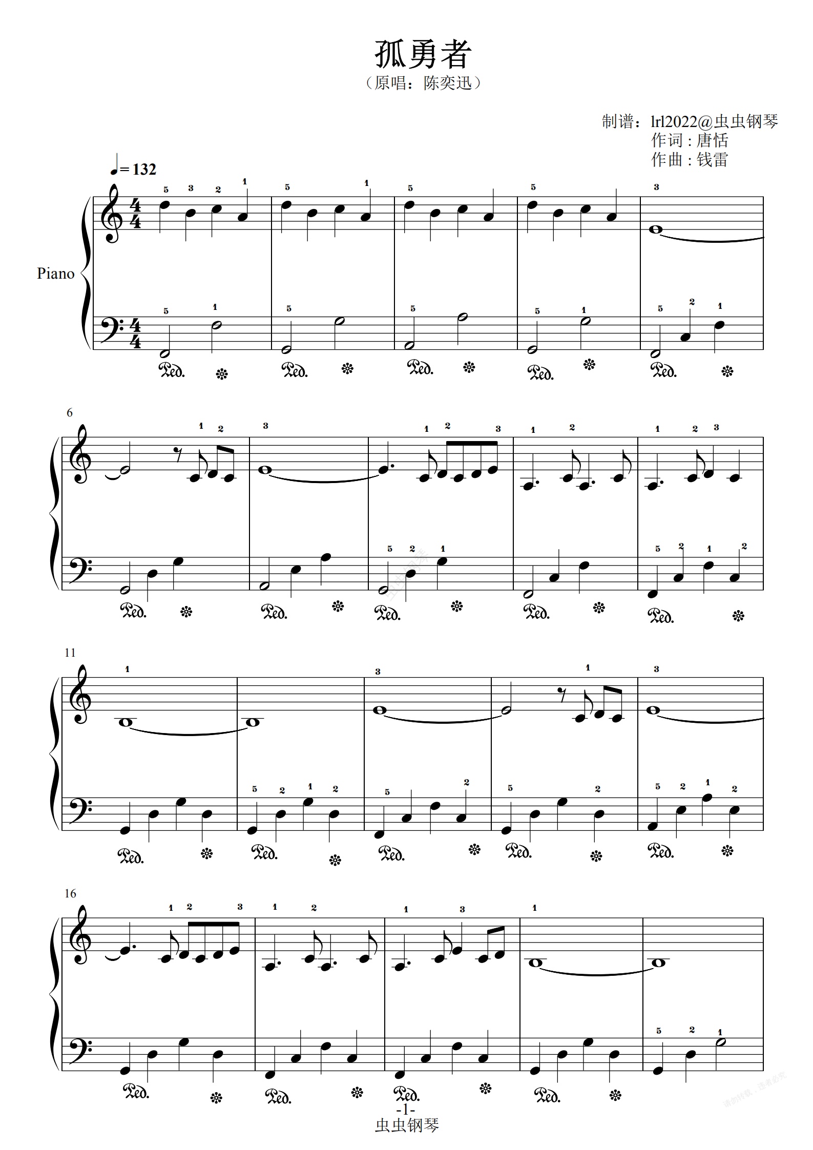 钢琴谱:孤勇者-C调-带指法-初学者简易版-五线谱-简谱