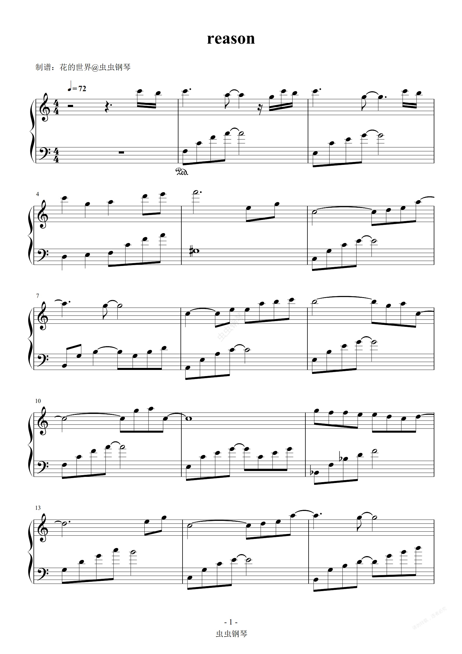 钢琴谱:Reason 蓝色生死恋 C调简易版本 经典流行
