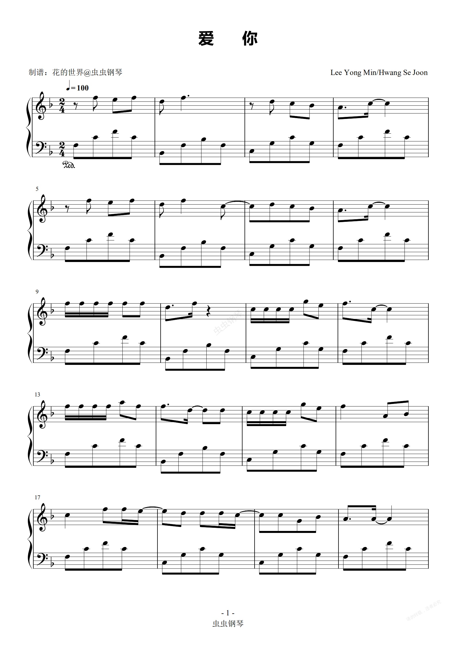 钢琴谱:爱你 原调简易版本 王心凌