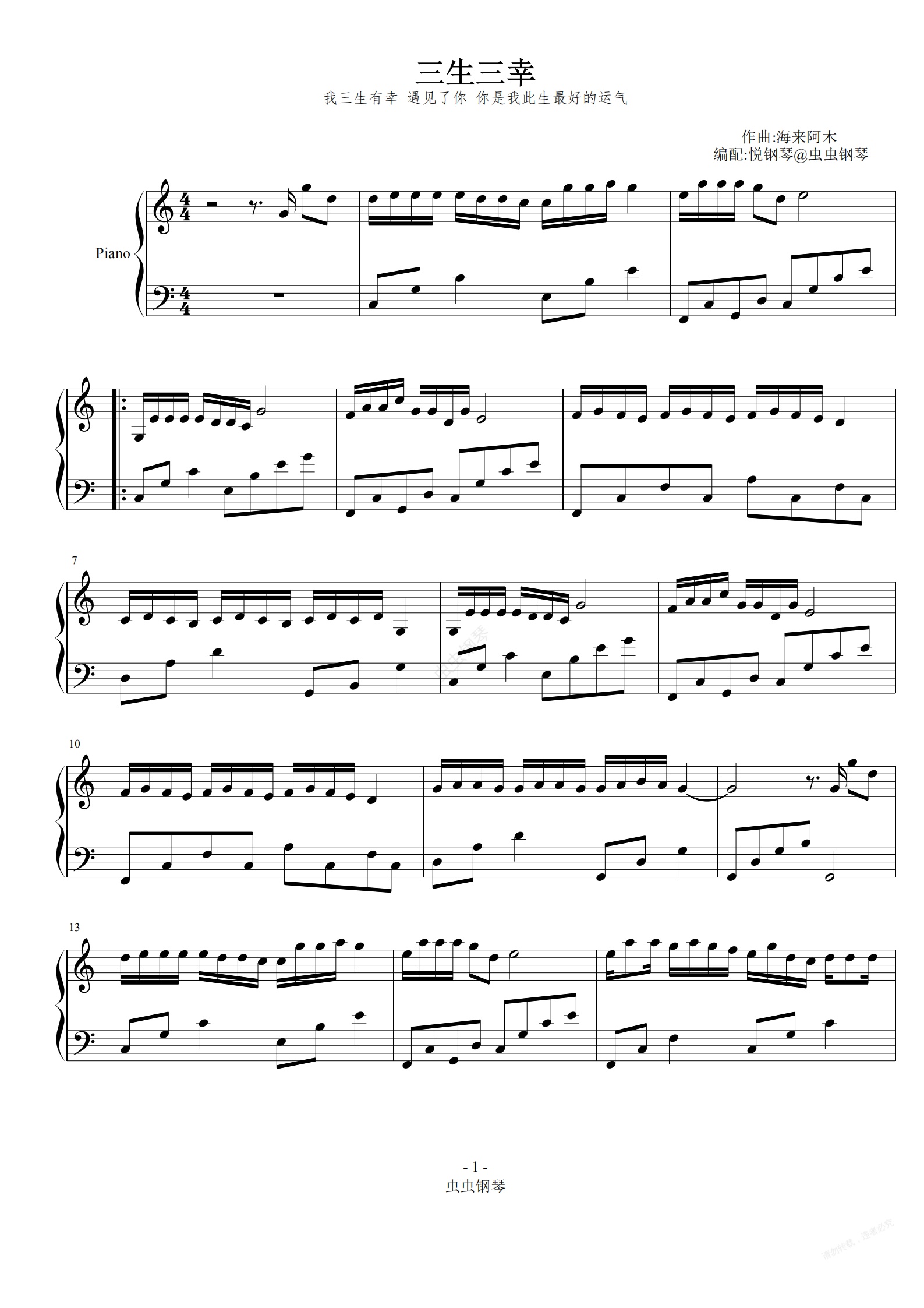 钢琴谱:三生三幸 (C调版)- 海来阿木