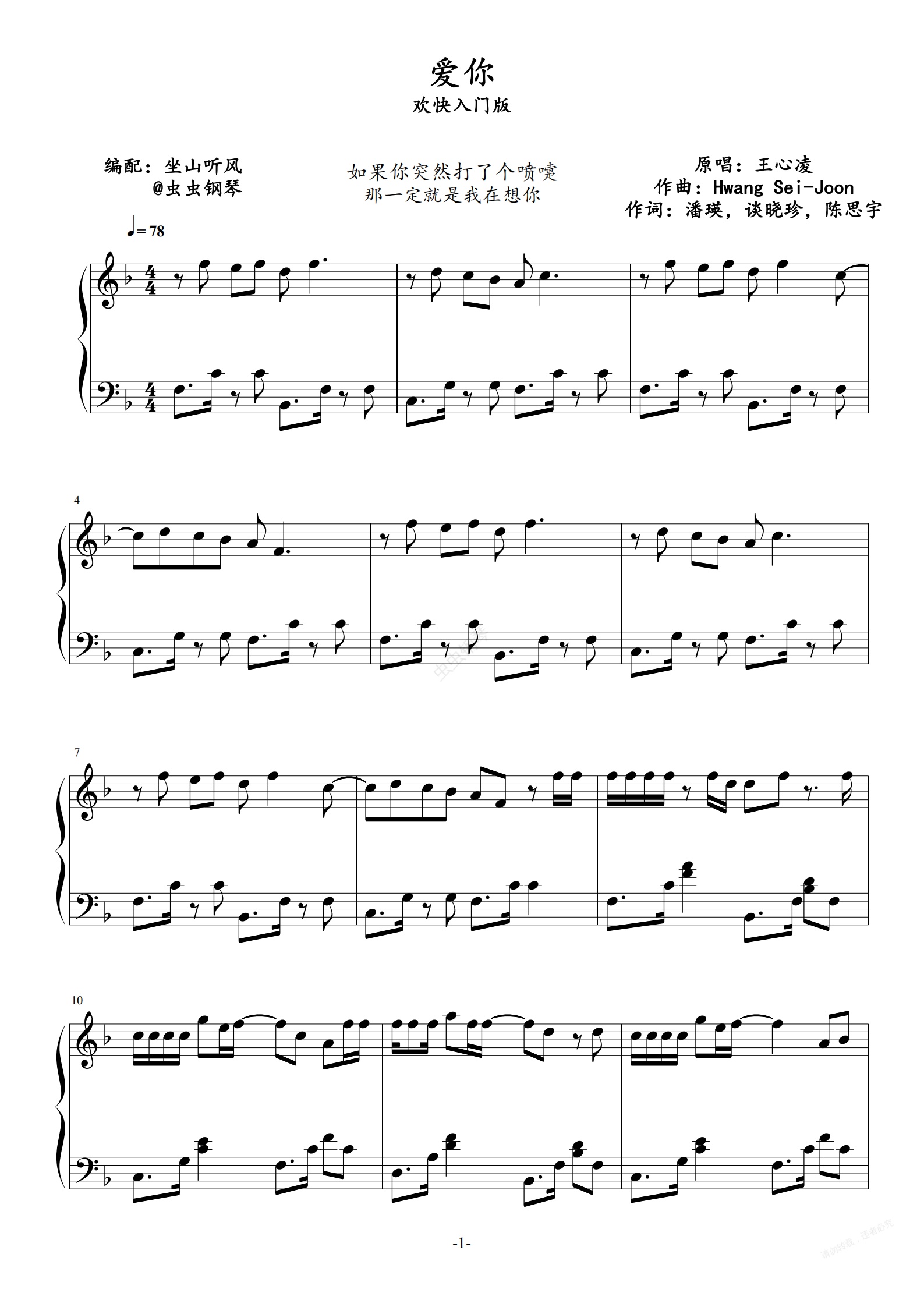 钢琴谱:爱你——王心凌【欢快入门版】F调