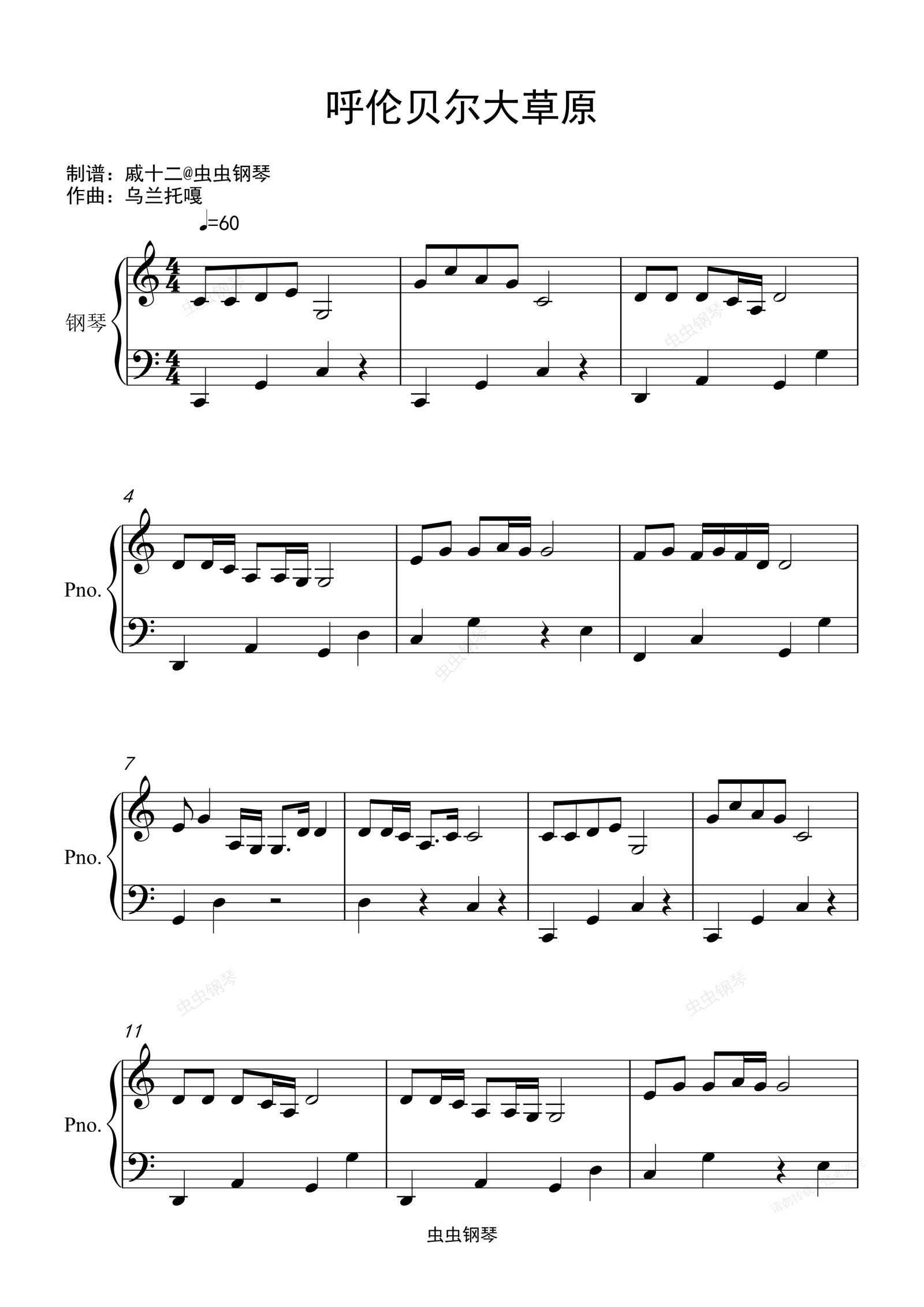 钢琴谱:呼伦贝尔大草原-C调简单版