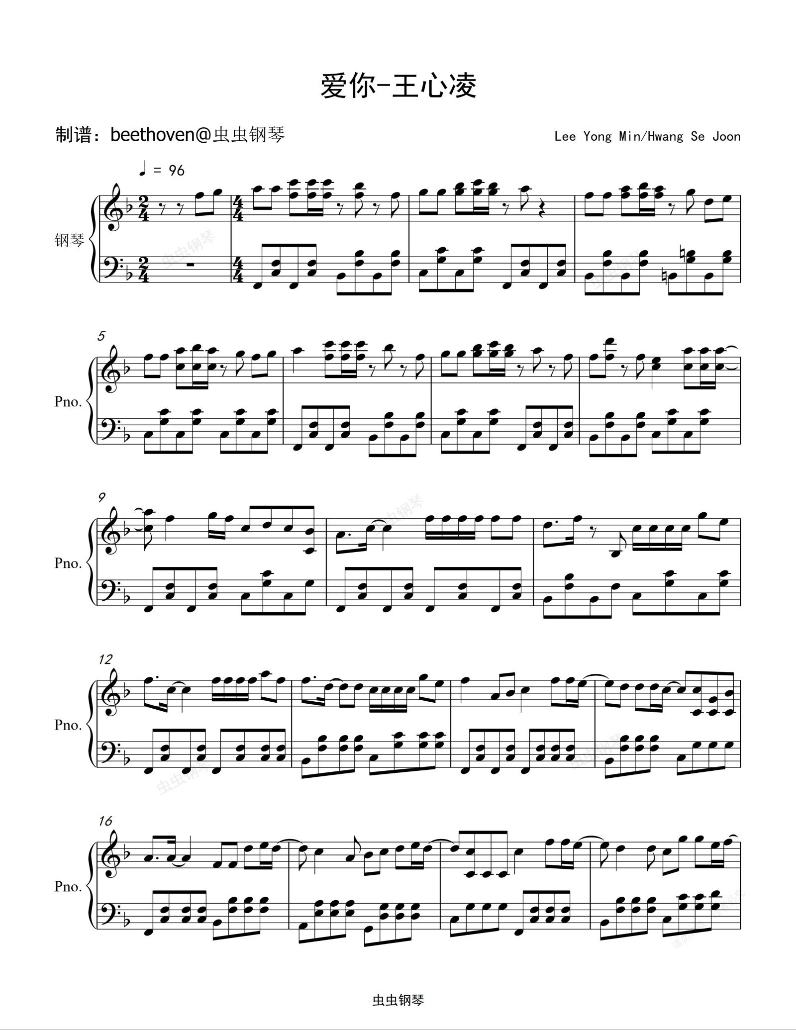 钢琴谱:爱你-王心凌(唯美好听原版)原调F调