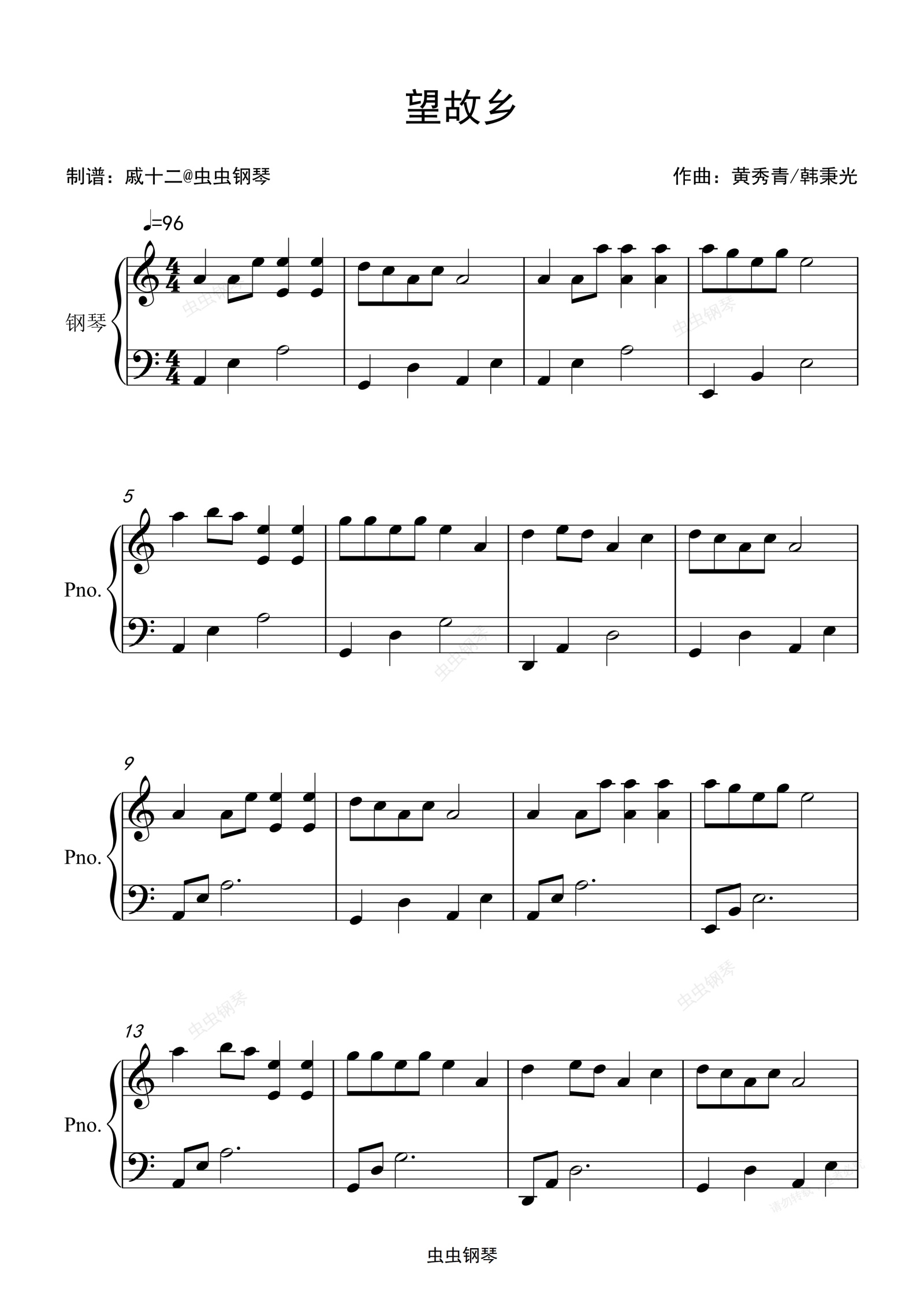 钢琴谱:望故乡-C调简单版