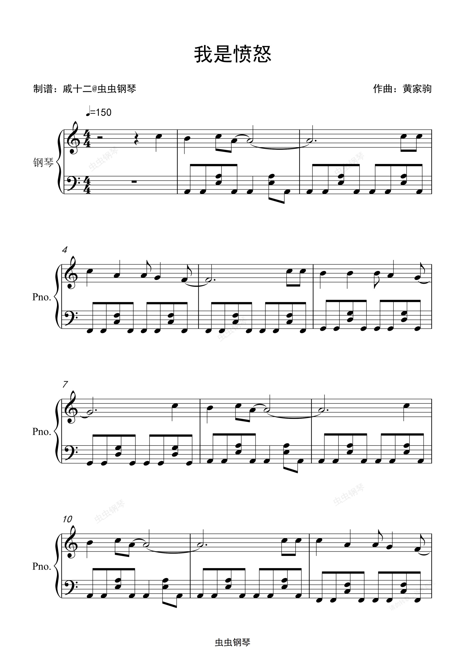 钢琴谱:我是愤怒-C调简单版