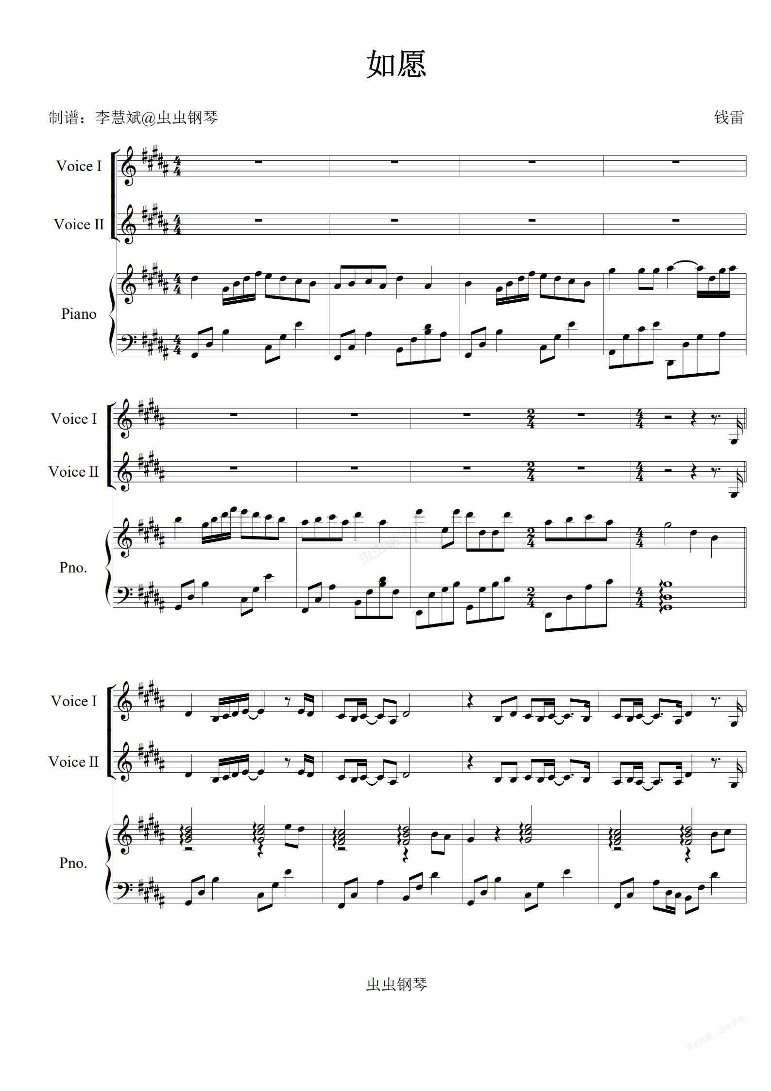 根据王菲《如愿》改编合唱,钢琴伴奏谱,适合弹唱,合唱伴奏