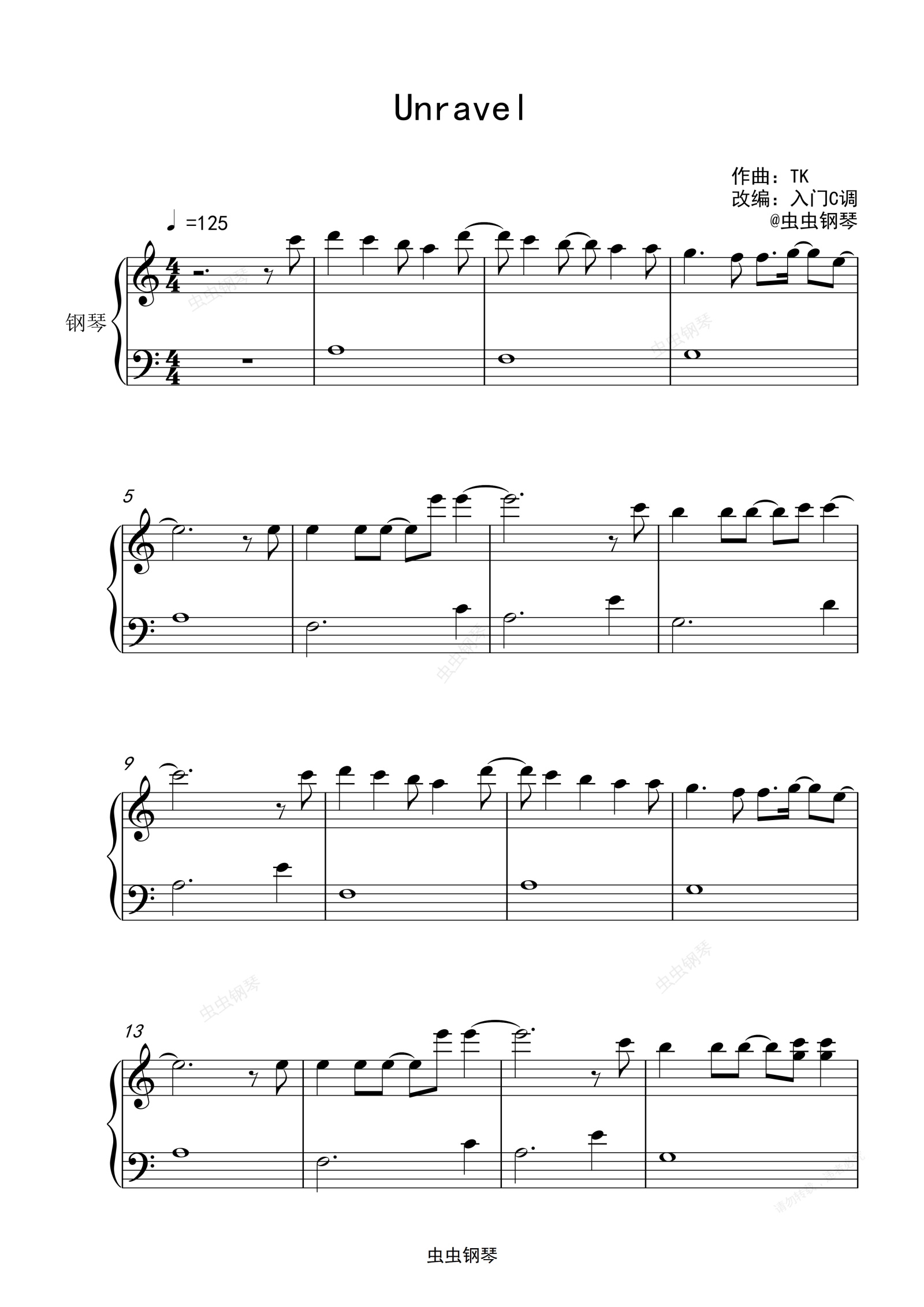 钢琴谱:《Unravel》入门C调简单版