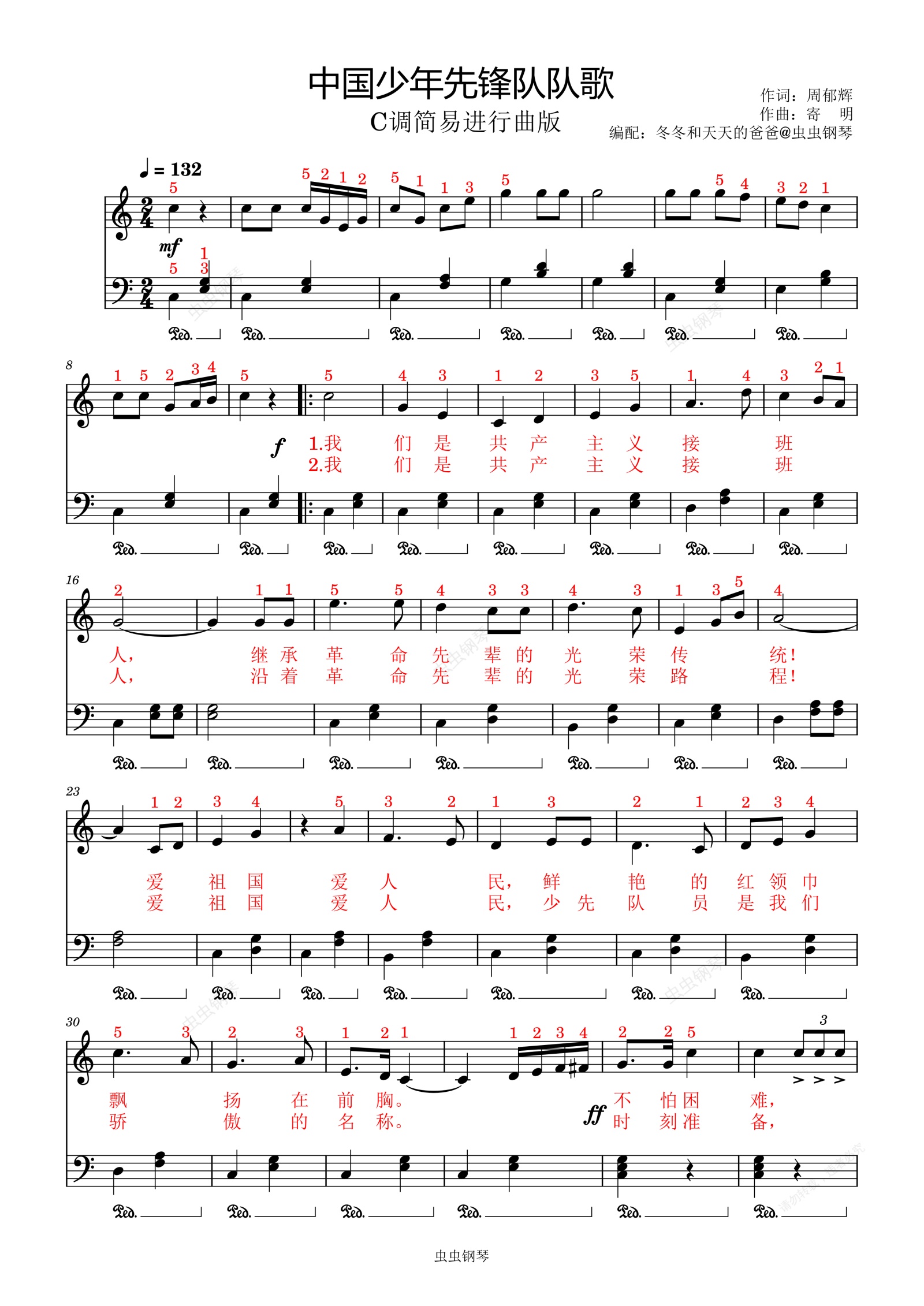 钢琴谱:中国少年先锋队队歌 C调进行曲【带指法】