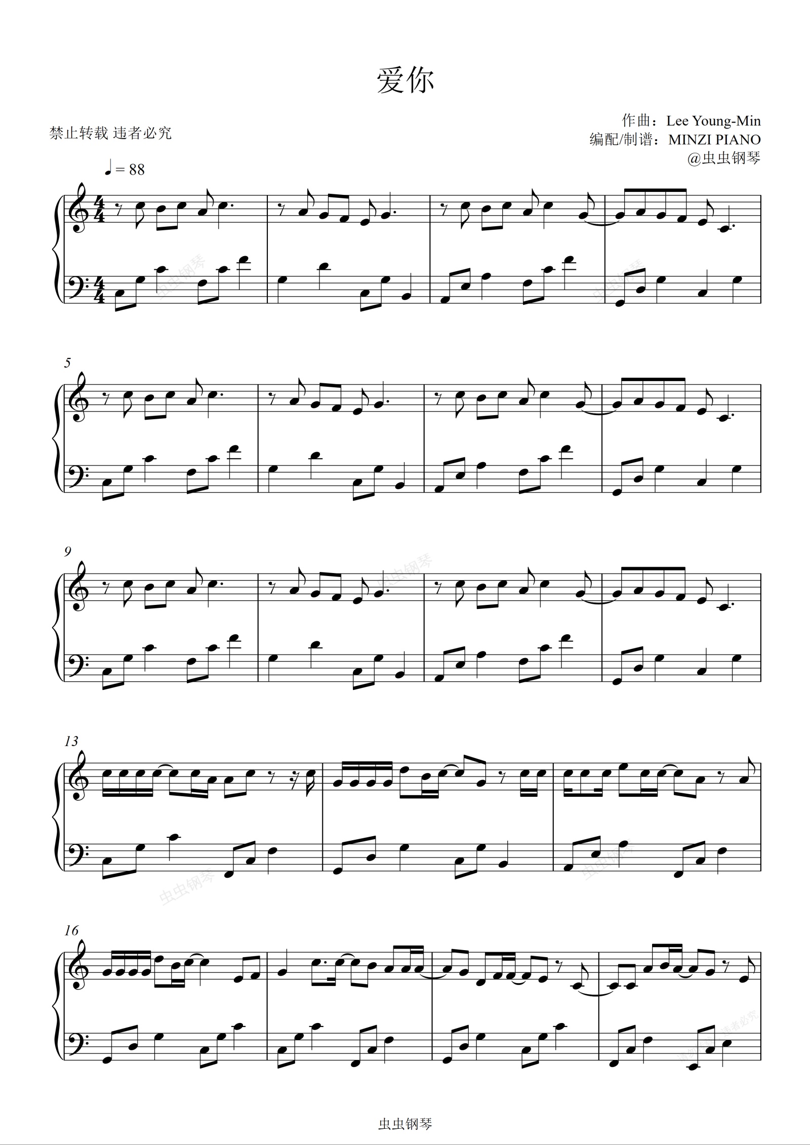钢琴谱:王心凌《爱你》C调 好听易弹