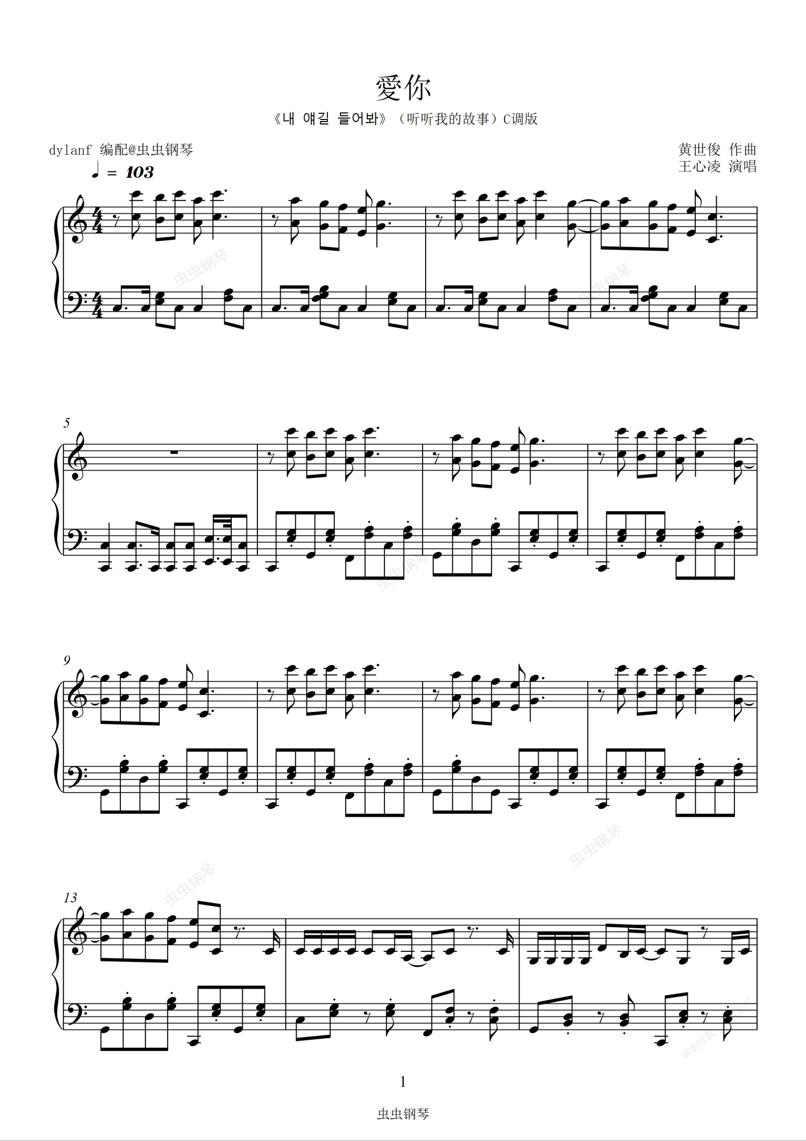钢琴谱:C调易弹《爱你》99%还原 王心凌《내 얘길 들어봐》(听听我的故事)