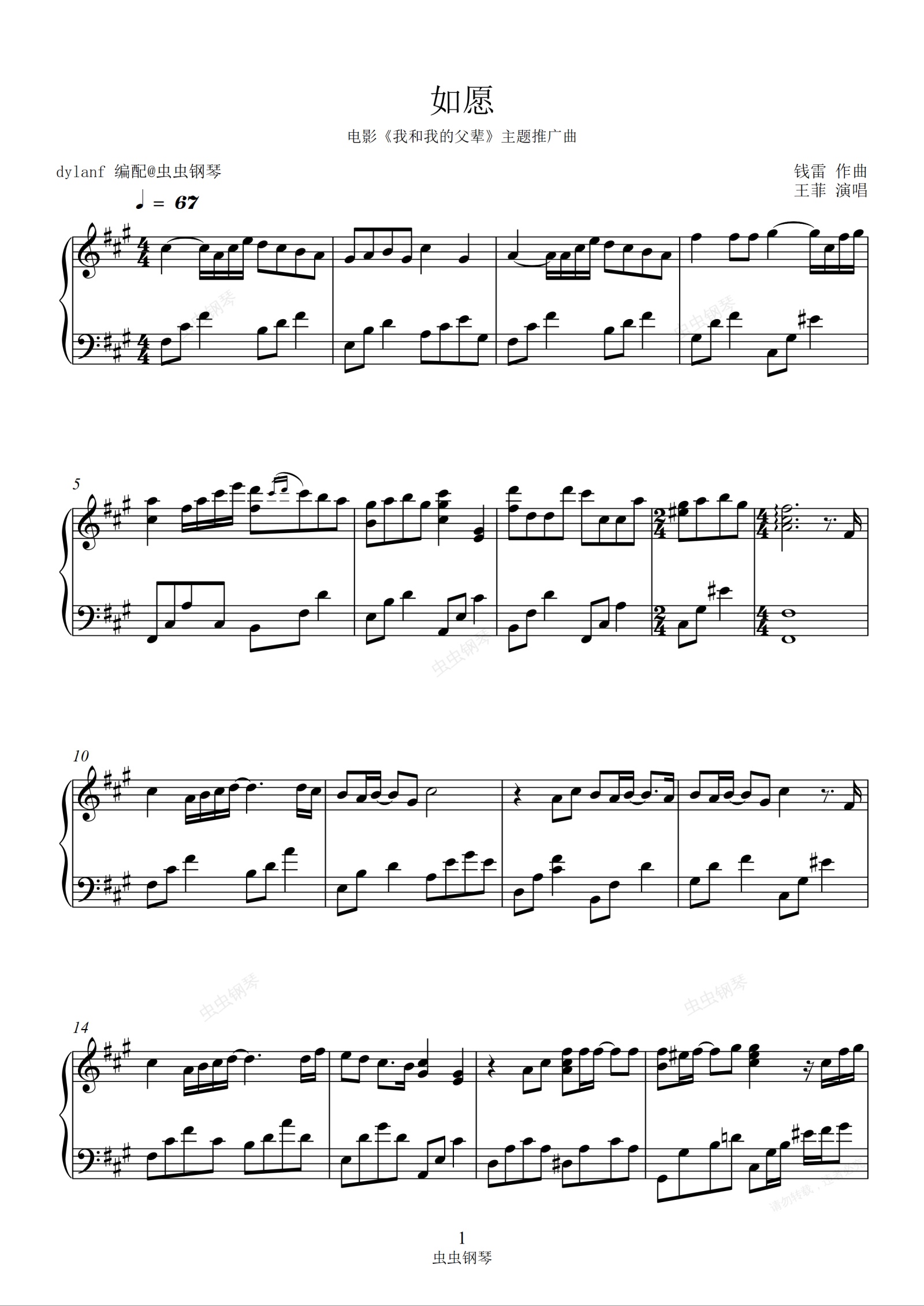 钢琴谱:好听易弹-如愿《我和我的父辈》主题曲 王菲