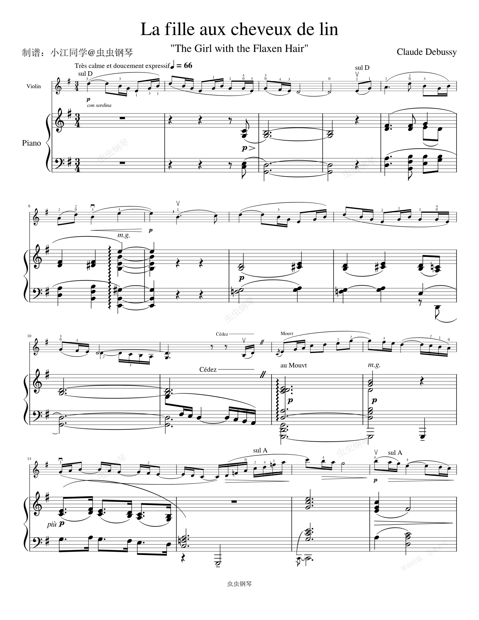 钢琴谱:亚麻色头发的女孩 小提琴+钢琴