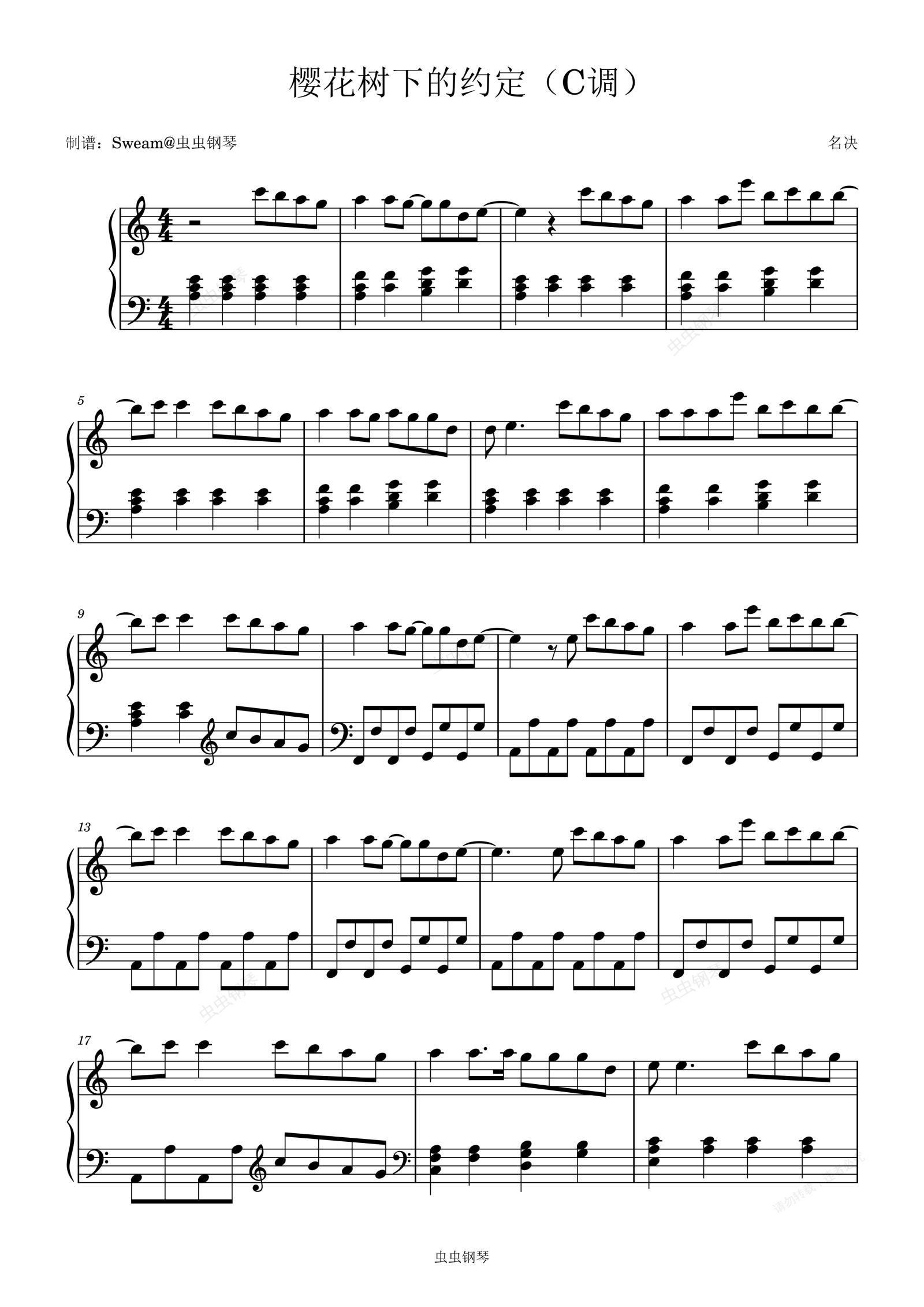 钢琴谱:樱花树下的约定(C调易上手入门夏日清爽完整版)-旺仔小乔