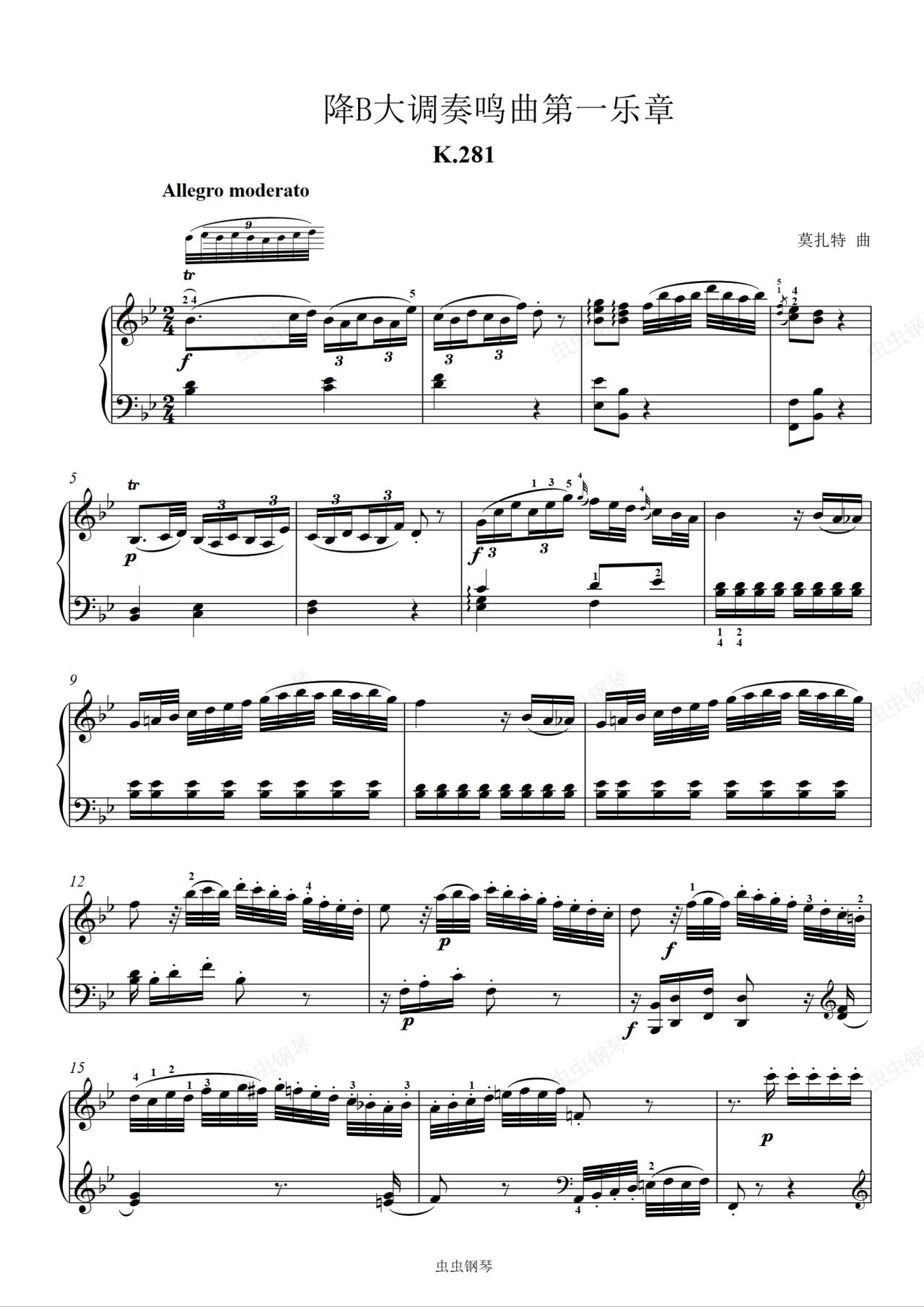 钢琴谱:10级-大型乐曲-降B大调奏鸣曲第一乐章K.281(莫扎特)