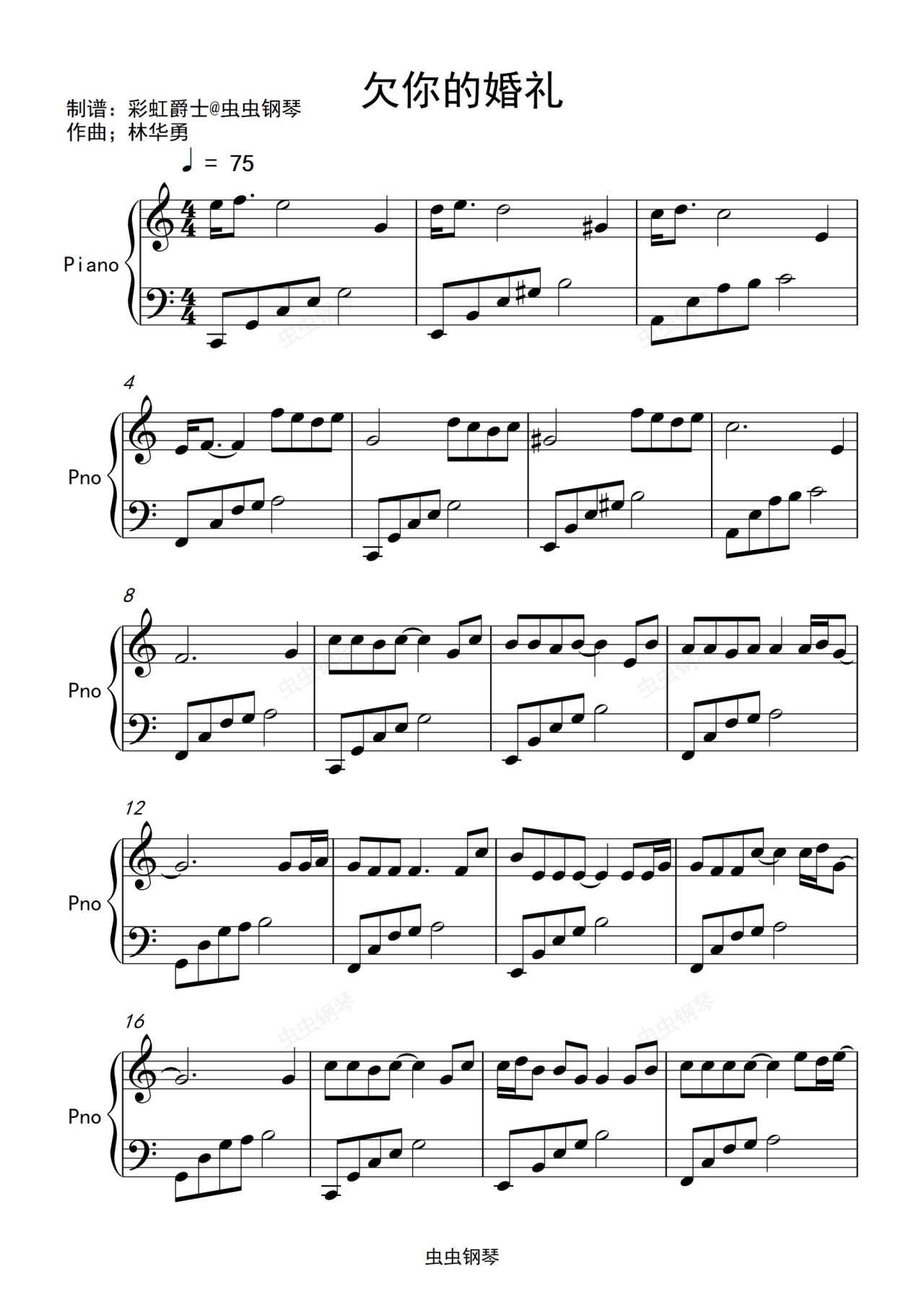 钢琴谱:欠你的婚礼-简单完整版 白小白