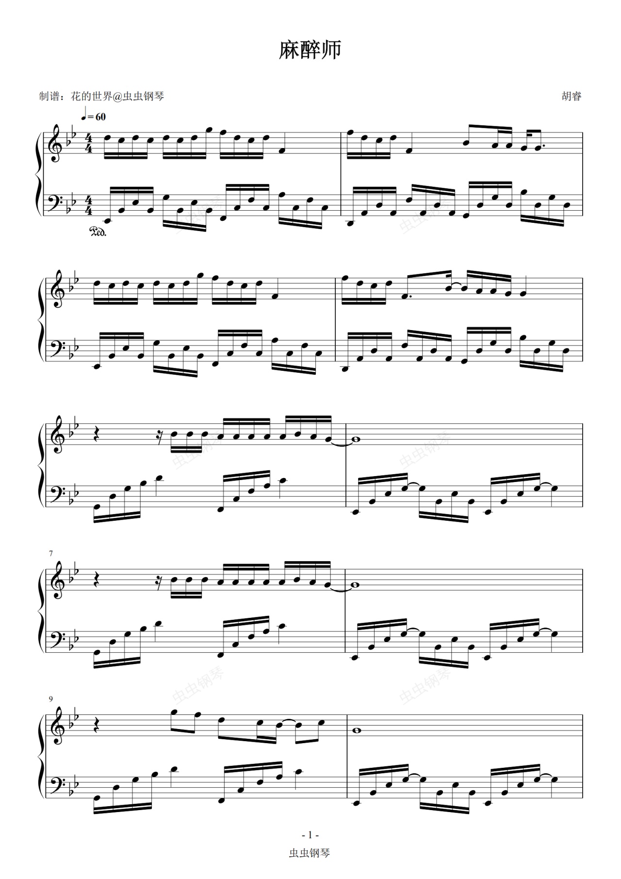 钢琴谱:麻醉师 原调简易版 胡睿