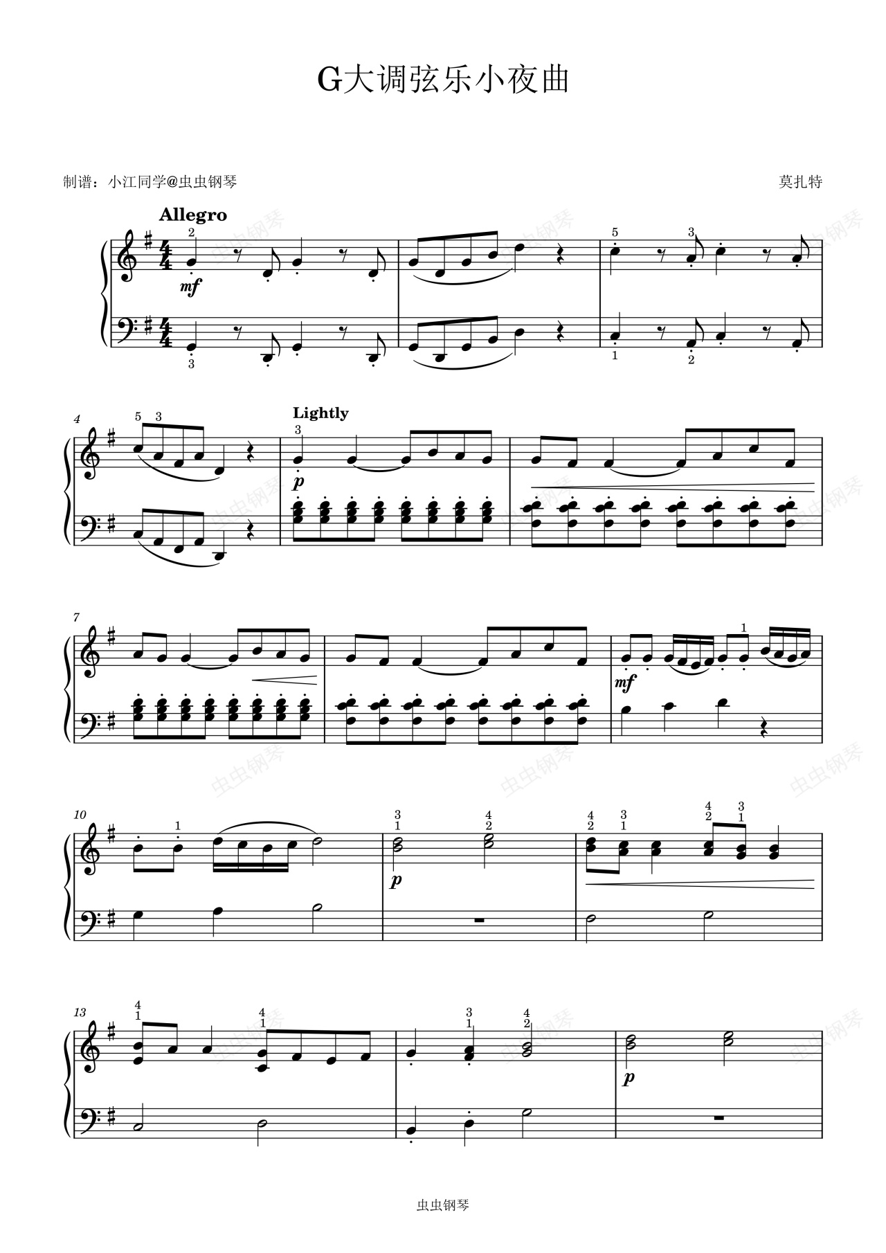钢琴谱:G大调弦乐小夜曲 简单版带指法