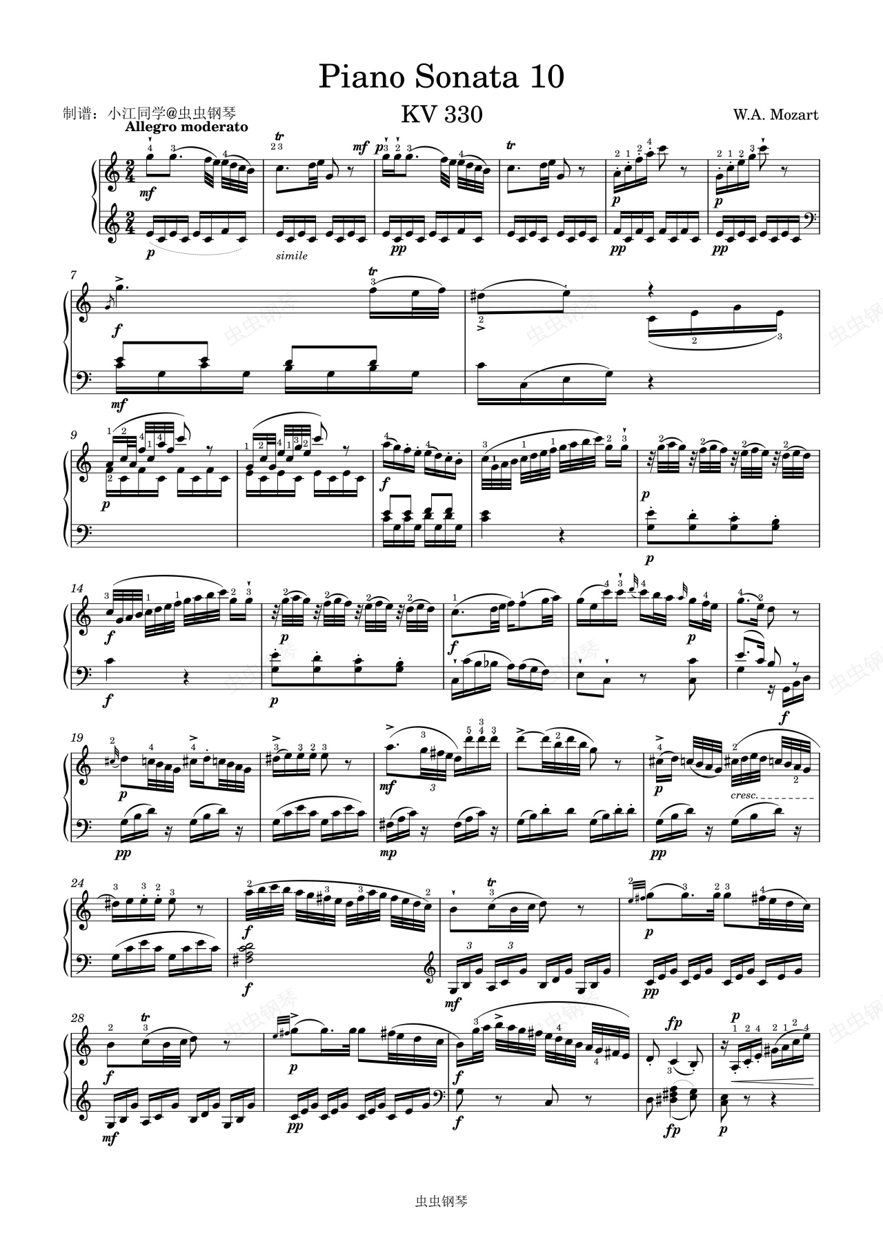 钢琴谱:莫扎特第十钢琴奏鸣曲 KV 330 带指法 第一乐章