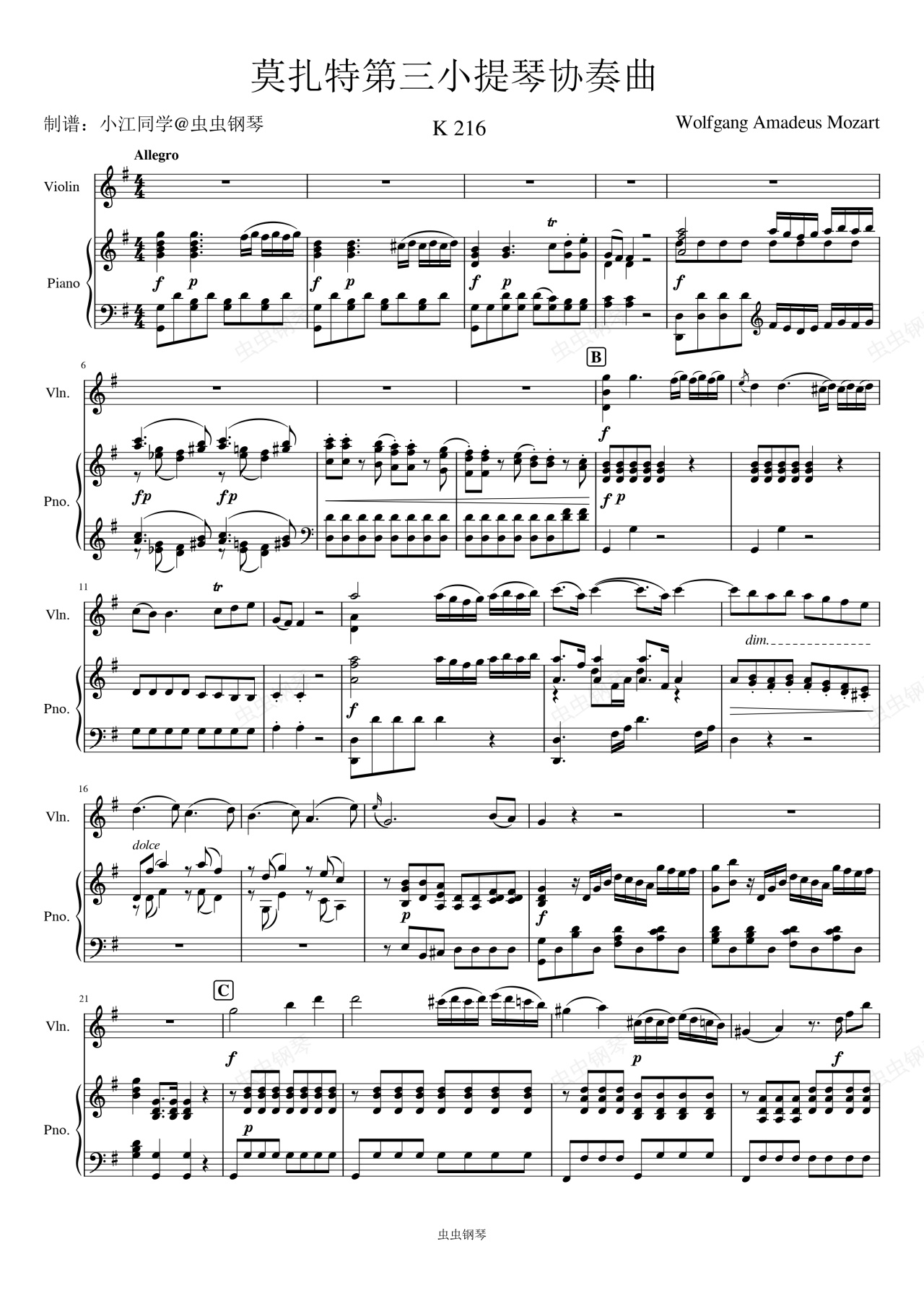钢琴谱:第三小提琴协奏曲 钢琴+小提琴 K.216
