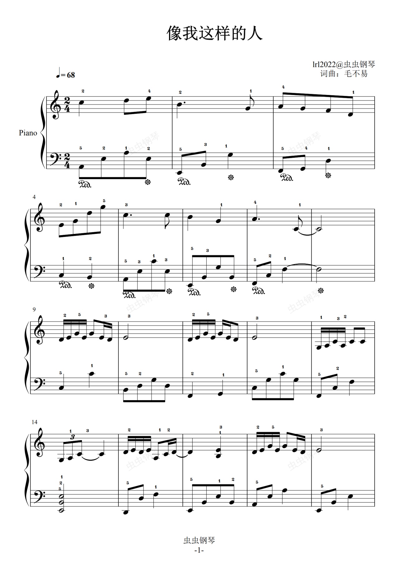 钢琴谱:《像我这样的人》-C调带指法-初学简单版-毛不易