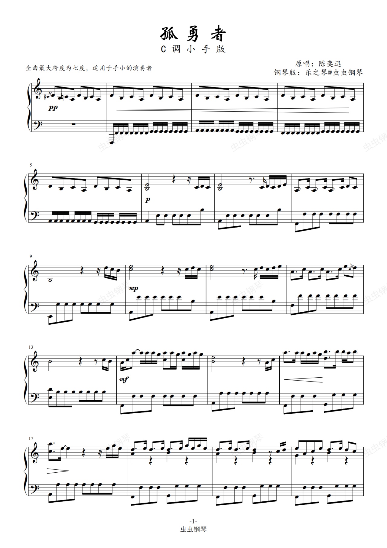 钢琴谱:孤勇者-C调小手版