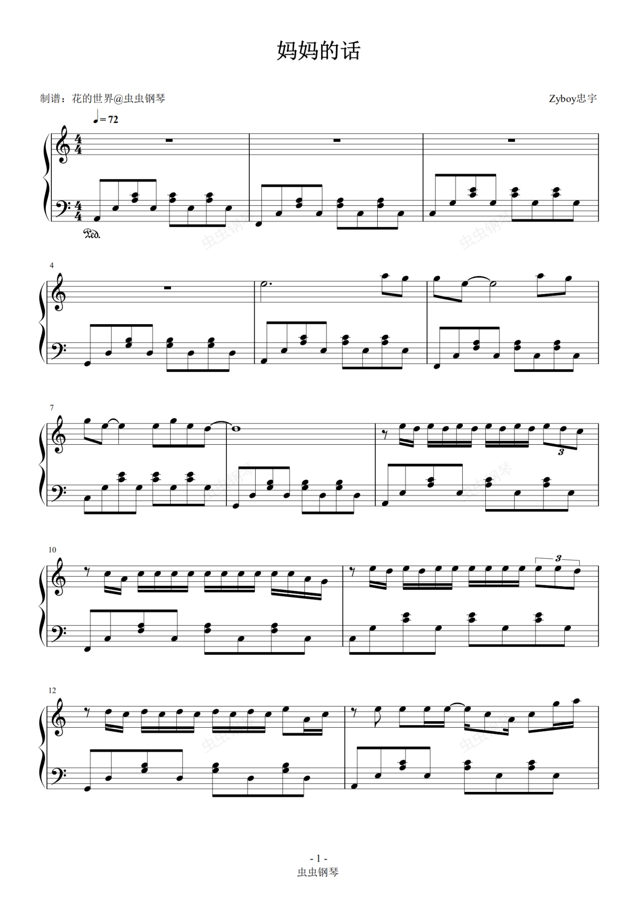 钢琴谱:妈妈的话 C调简易版 Zyboy忠宇