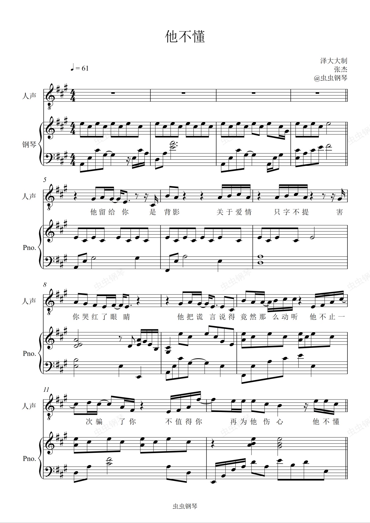 钢琴谱:他不懂【原版弹唱附词】泽大大 张杰