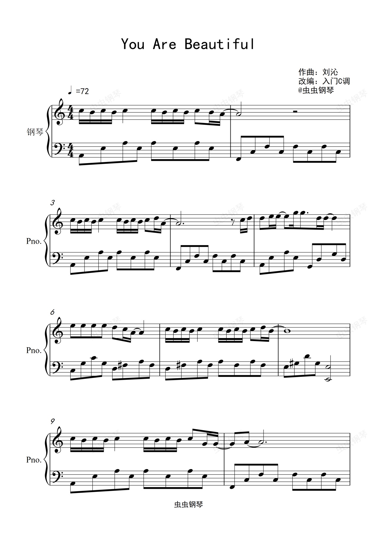 钢琴谱:《寒武纪》主题曲《You Are Beautiful》入门C调简单版