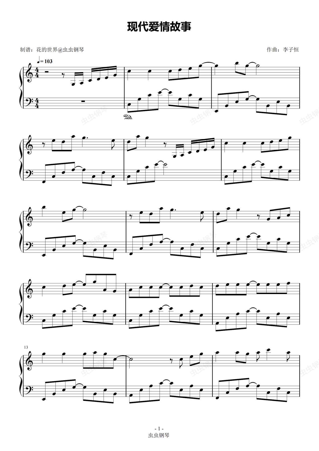 钢琴谱:现代爱情故事 C调简易版 张智霖 /许秋怡 流行经典