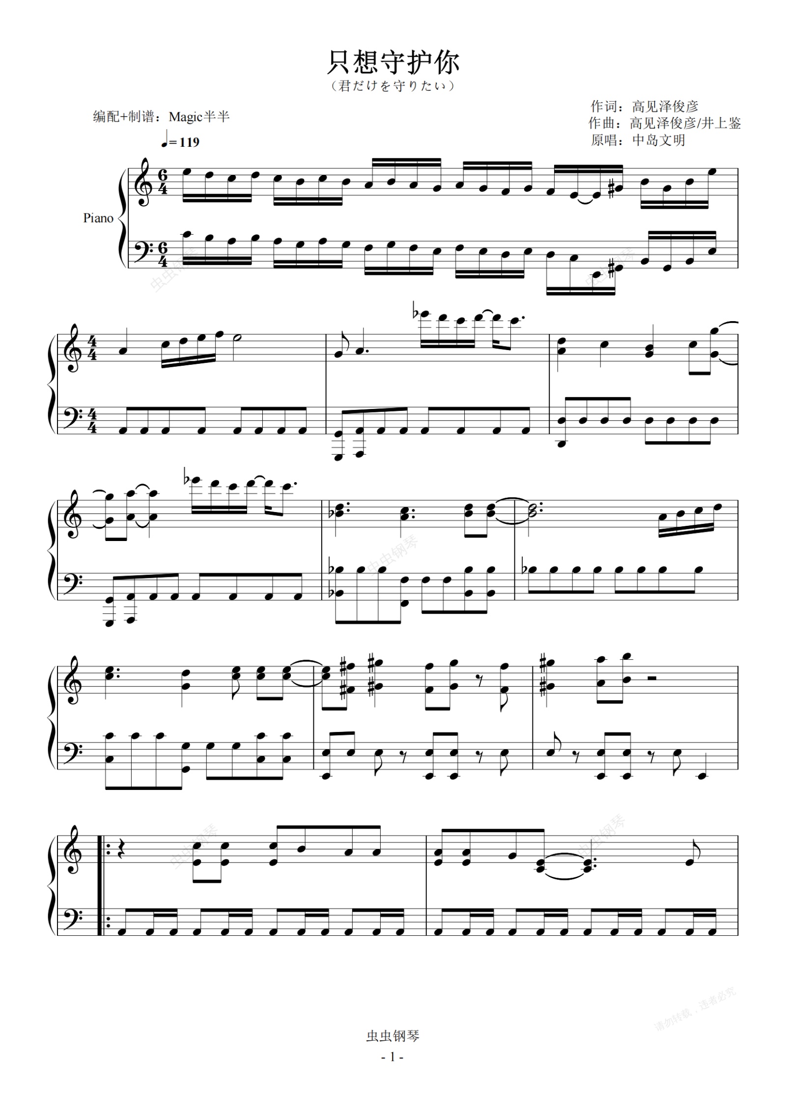 钢琴谱:只想守护你 戴拿ED经典版(C调)