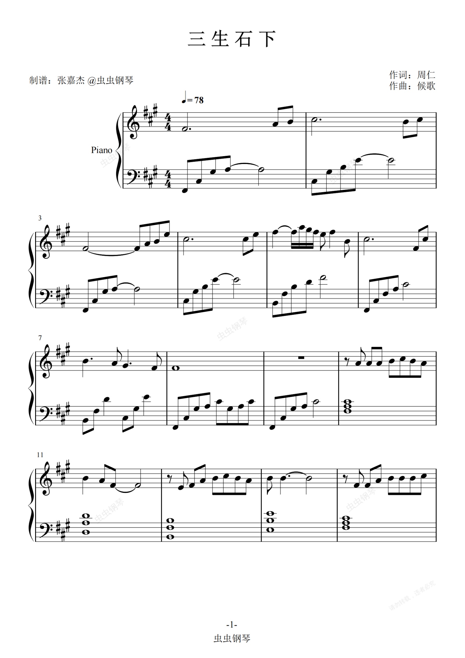 钢琴谱:三生石下独奏(也可用于带旋律伴奏)