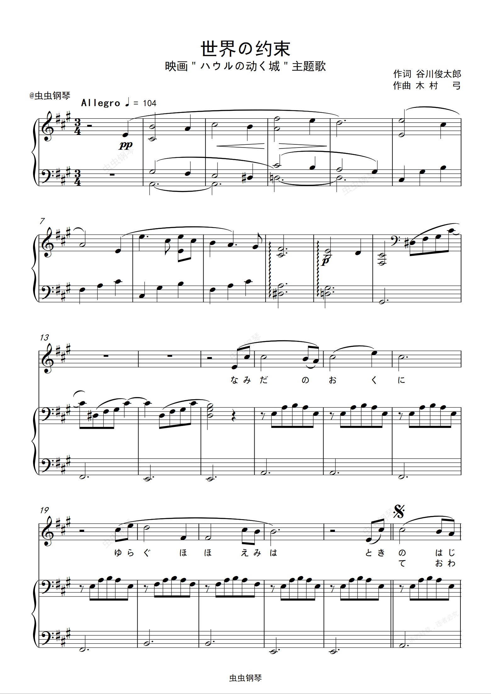 钢琴谱:世界の約束(ハウルの動く城)主题歌