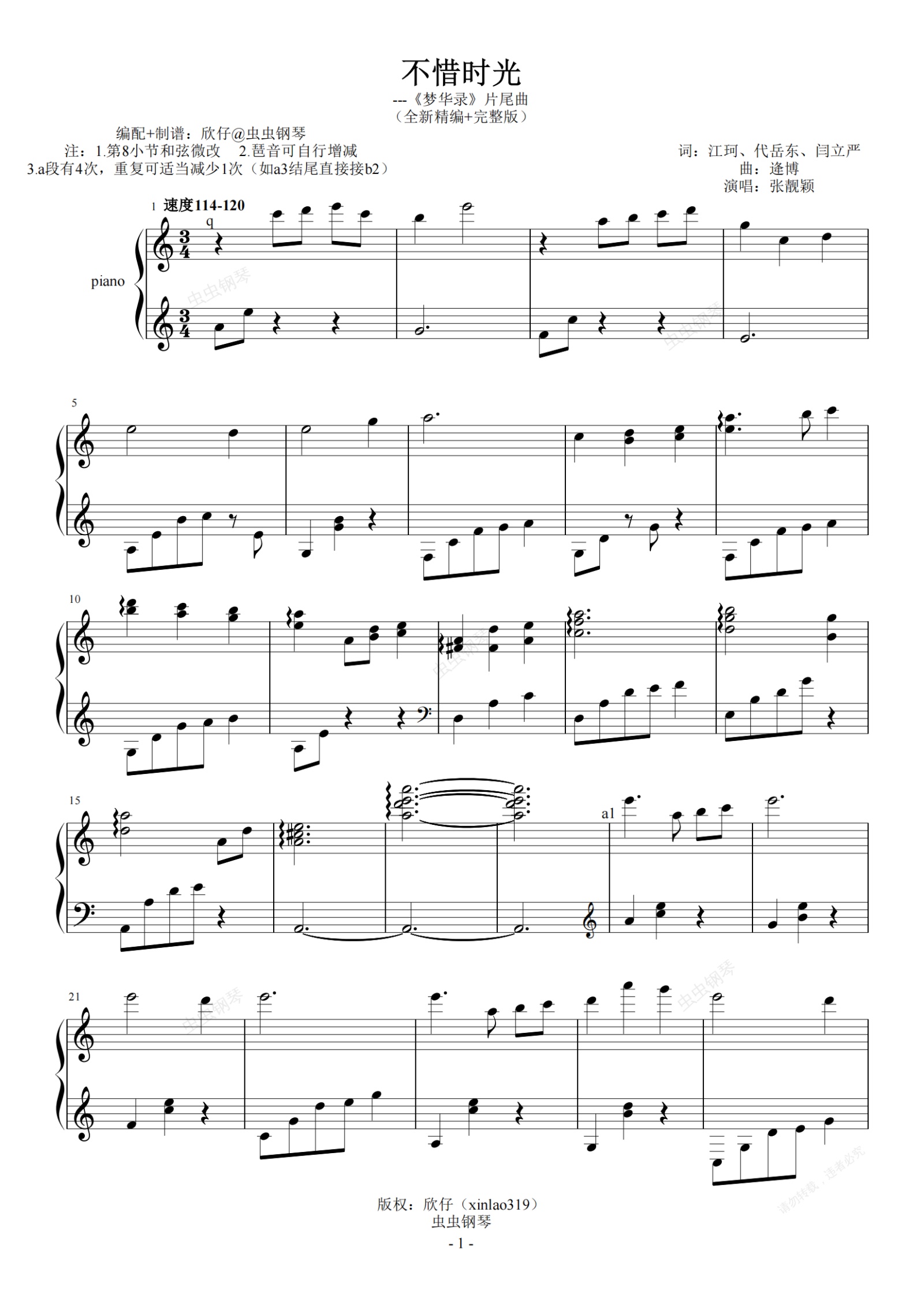钢琴谱:张靓颖-C《不惜时光》(《梦华录》片尾、全新精编+完整版)