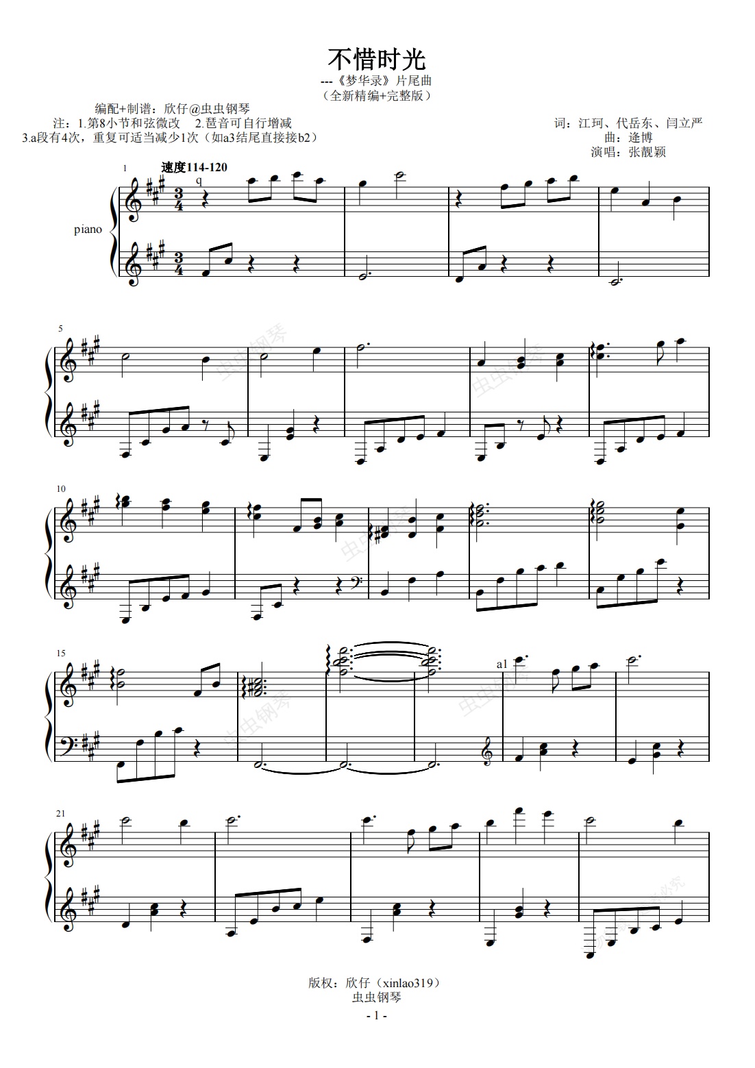 钢琴谱:张靓颖-A《不惜时光》(《梦华录》片尾、全新精编+完整版)