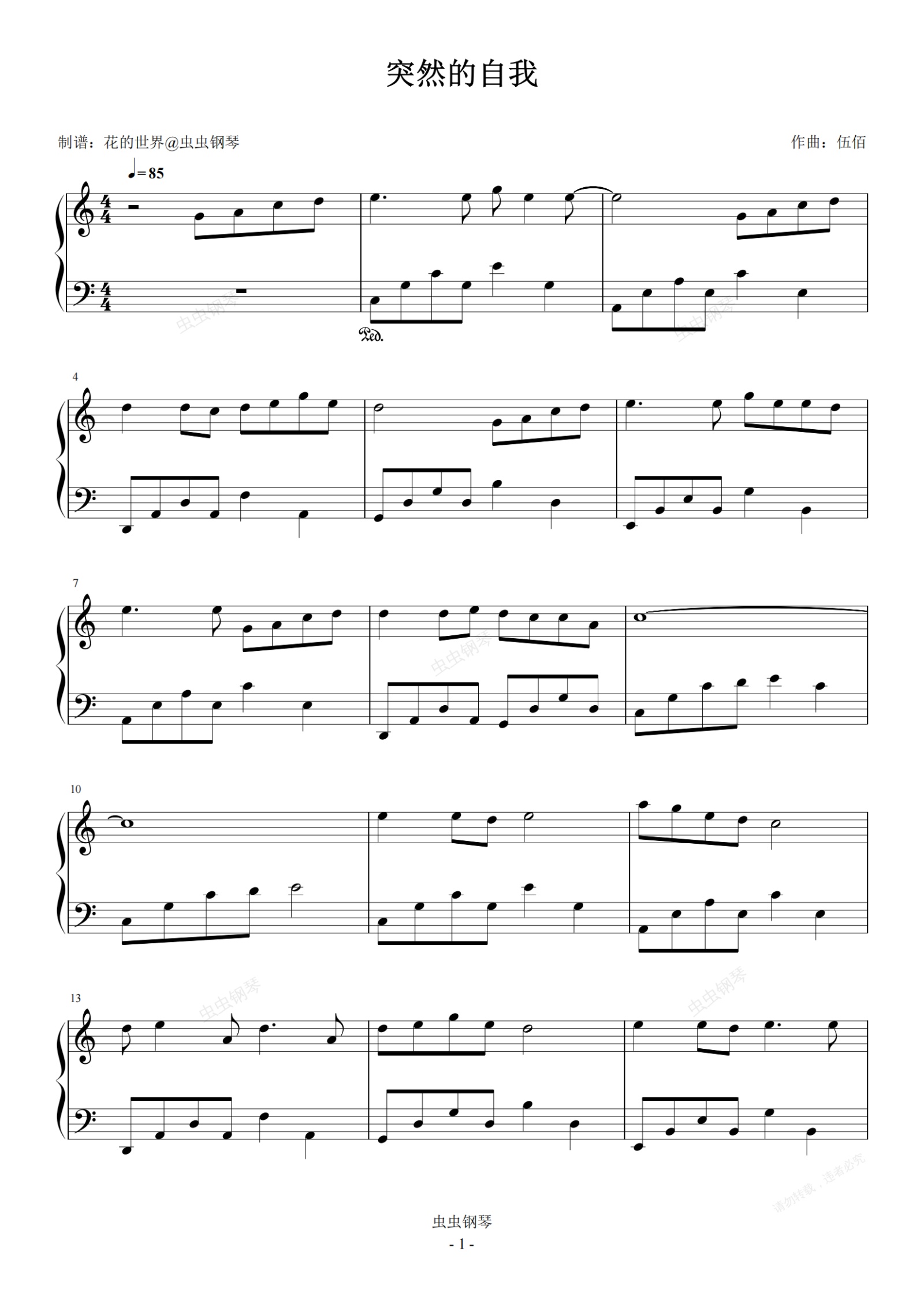 钢琴谱:突然的自我  C调简易版本 伍佰