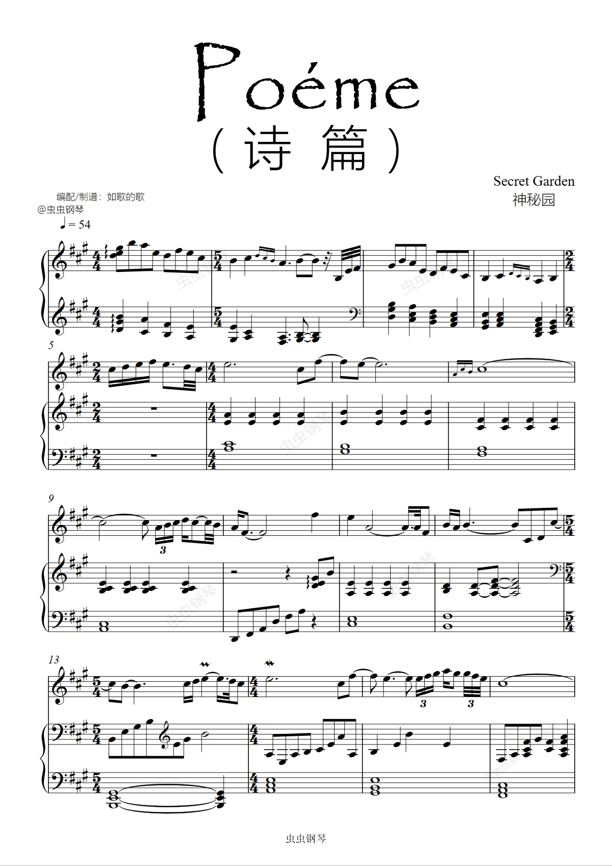钢琴谱:Poéme诗篇旋律+钢伴自Secret Garden神秘园《白石》