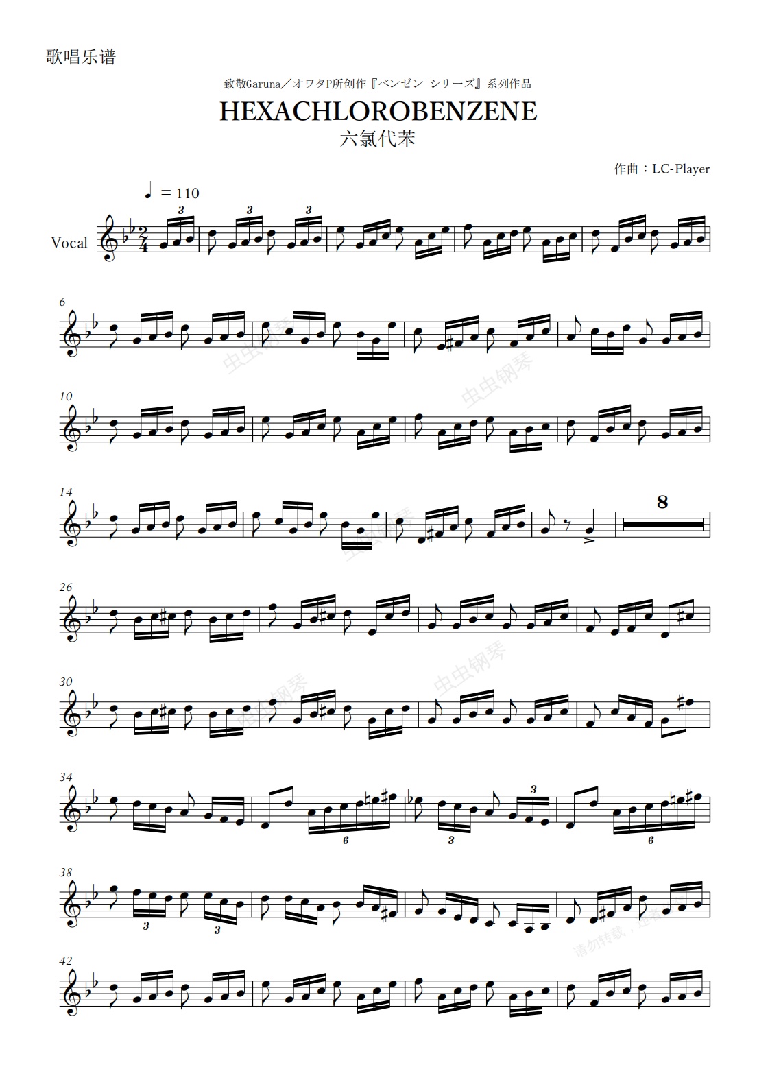 原创《/六氯代苯》之中的歌唱乐谱与歌词。(非钢琴谱或总谱)