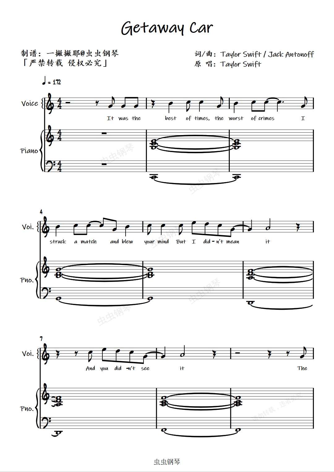 钢琴谱:Getaway Car【弹唱谱】Taylor Swift 泰勒·斯威夫特「一撇撇耶」