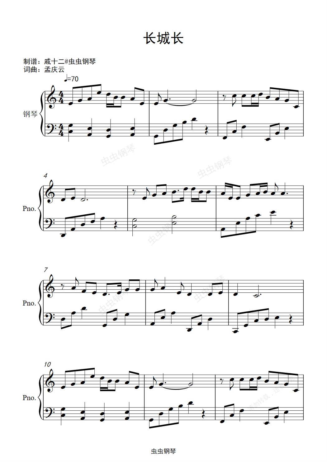钢琴谱:长城长 -C调简单版