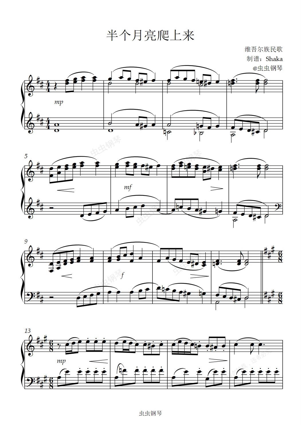 钢琴谱:半个月亮爬上来 D调版 上海音乐学院5级考级曲目