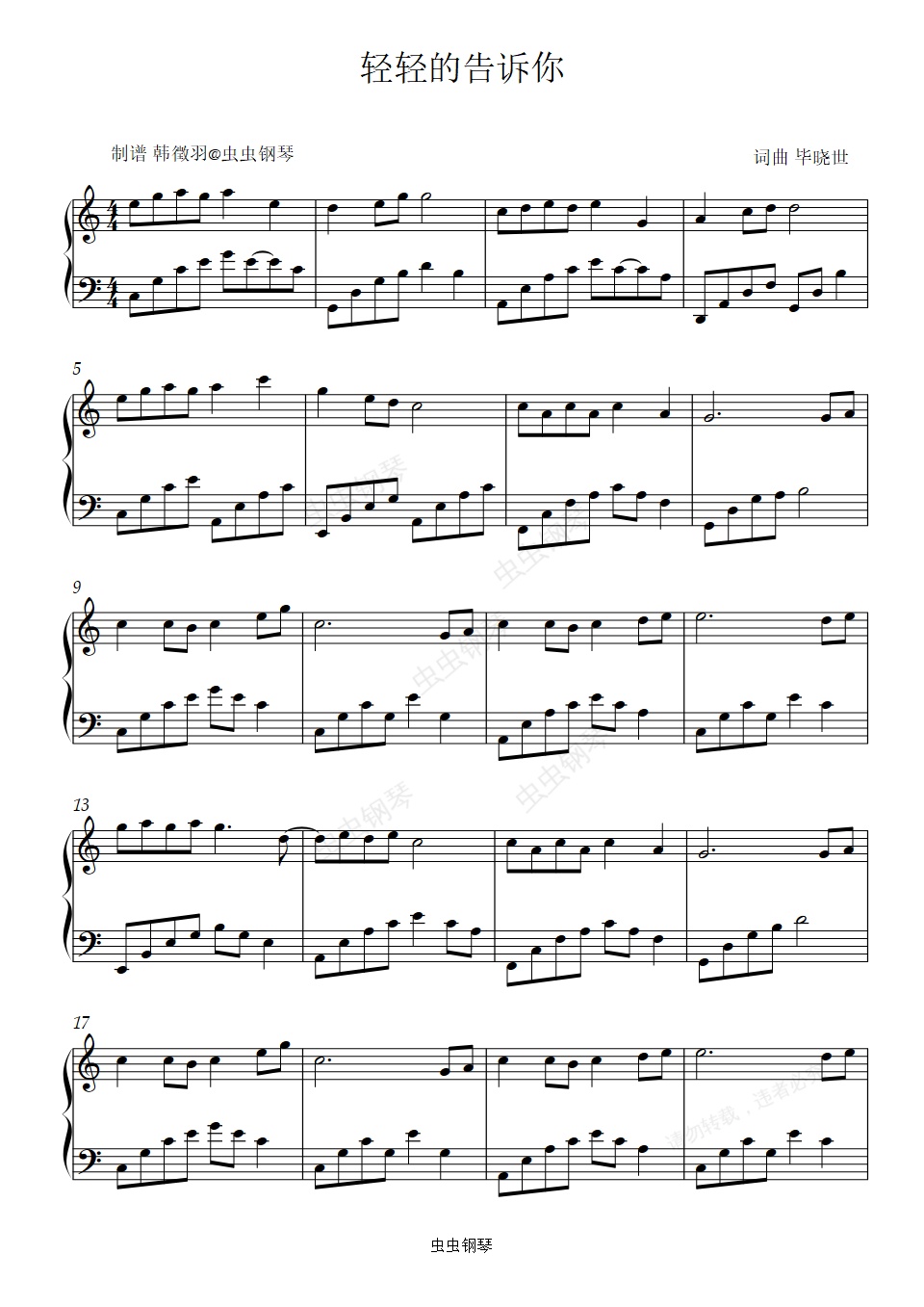钢琴谱:轻轻地告诉你 C调简单易弹