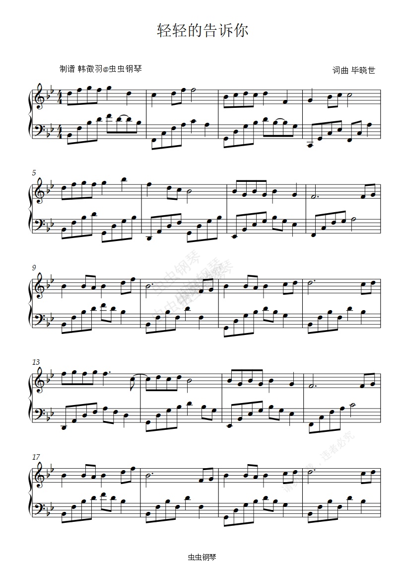钢琴谱:轻轻地告诉你 原调 简单易弹