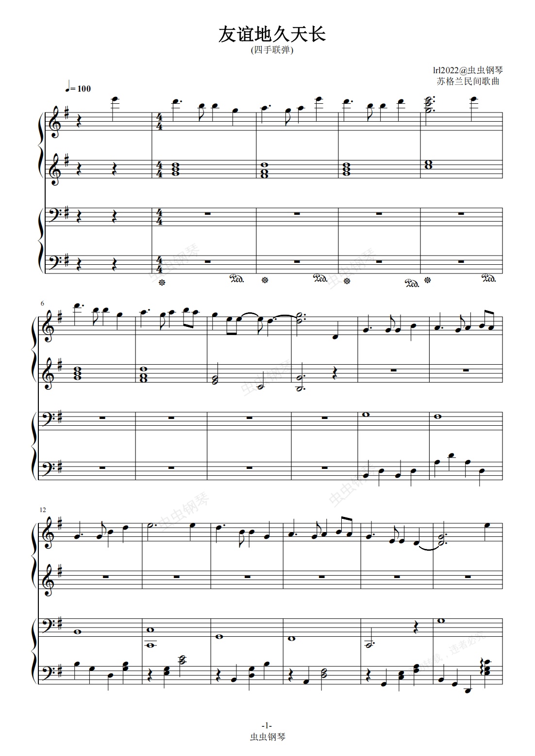 钢琴谱:《友谊天长地久》-四手联弹-G调