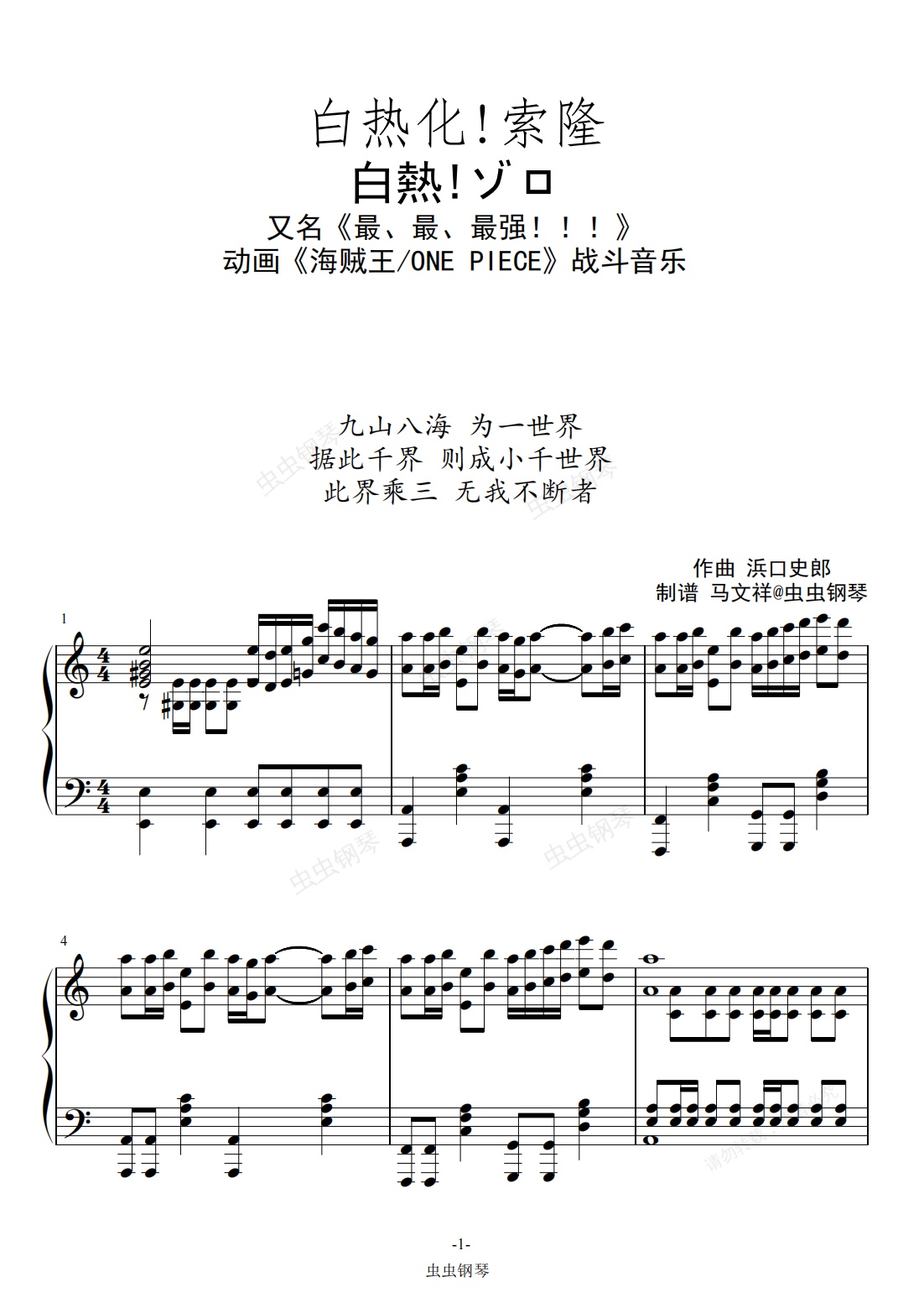钢琴谱:白熱!ゾロ /白热化!索隆-海贼王/ONE PIECE战斗音乐