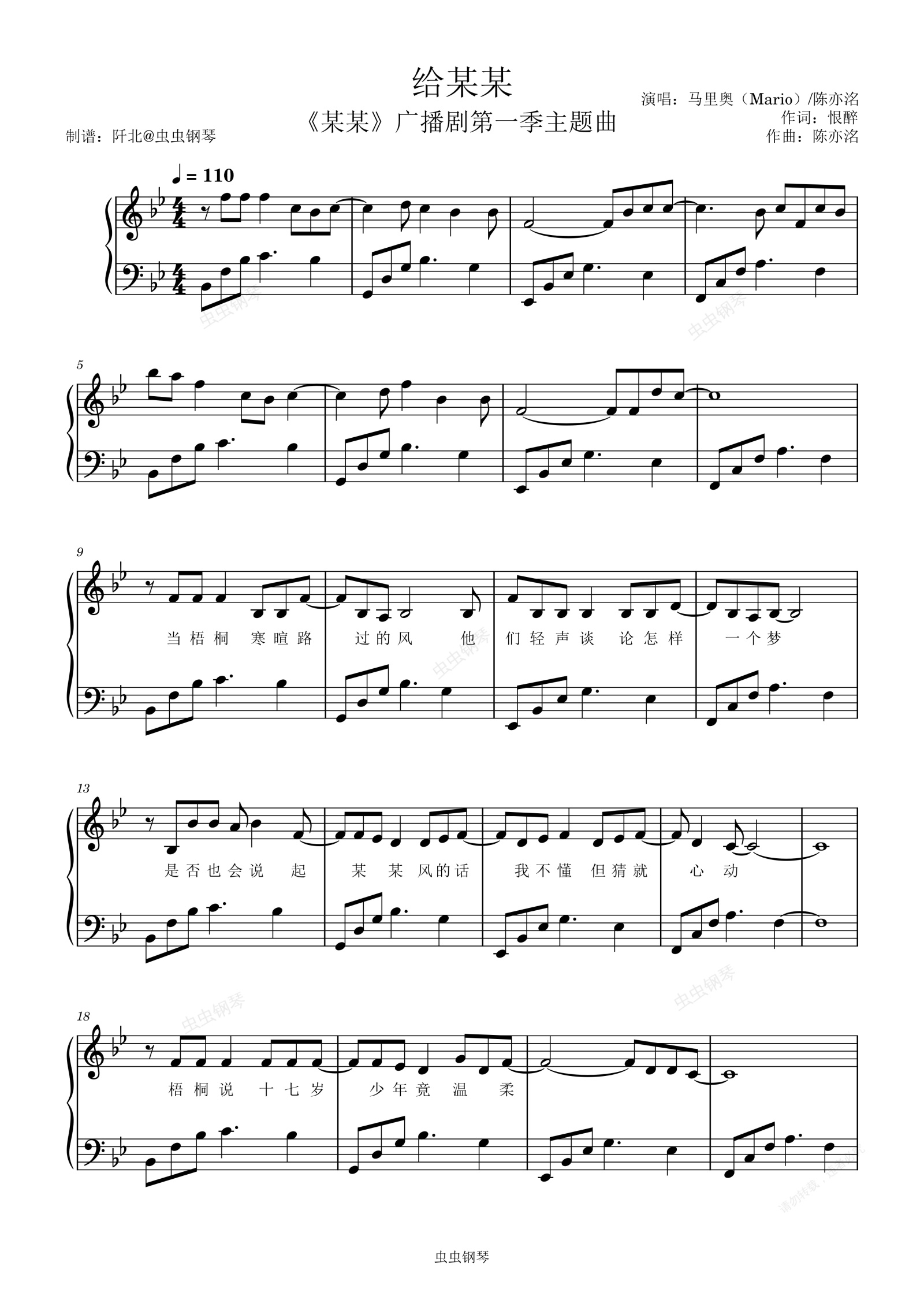 钢琴谱:《给某某》陈亦洺/马里奥【《某某》广播剧主题曲】